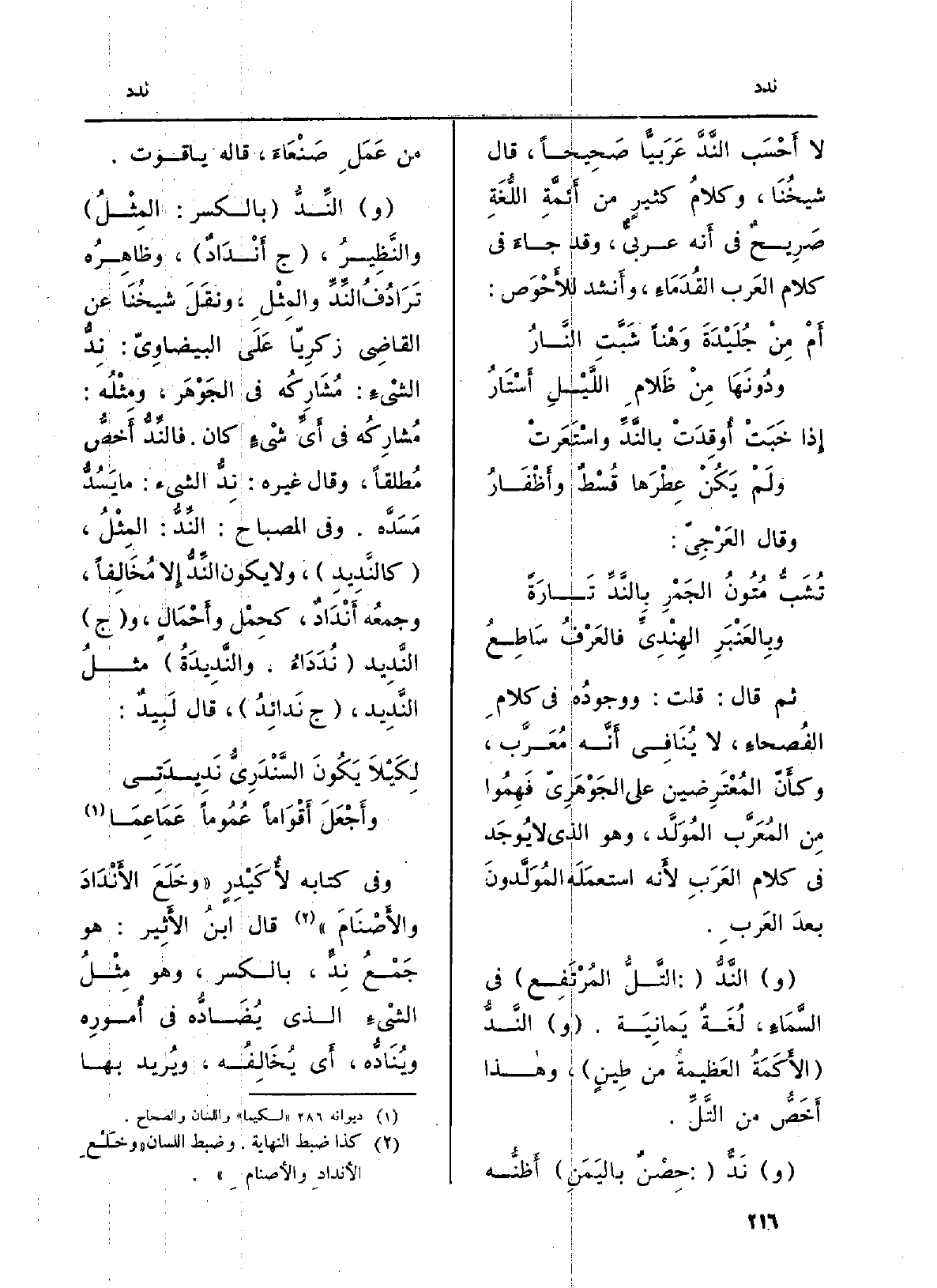 لَا أَحْسَب {النَّدَّ عَرَبيًّا صَحِيحاً، قَالَ شيخُنَا، وكلامُ كثيرٍ من أَئمَّةِ اللُّغَةِ صَرِيحٌ فِي أَنه عربيٌّ، وَقد جاءَ فِي كَلَام العَرب القُدَمَاءِ، وأَنشد للأَحْوَص: