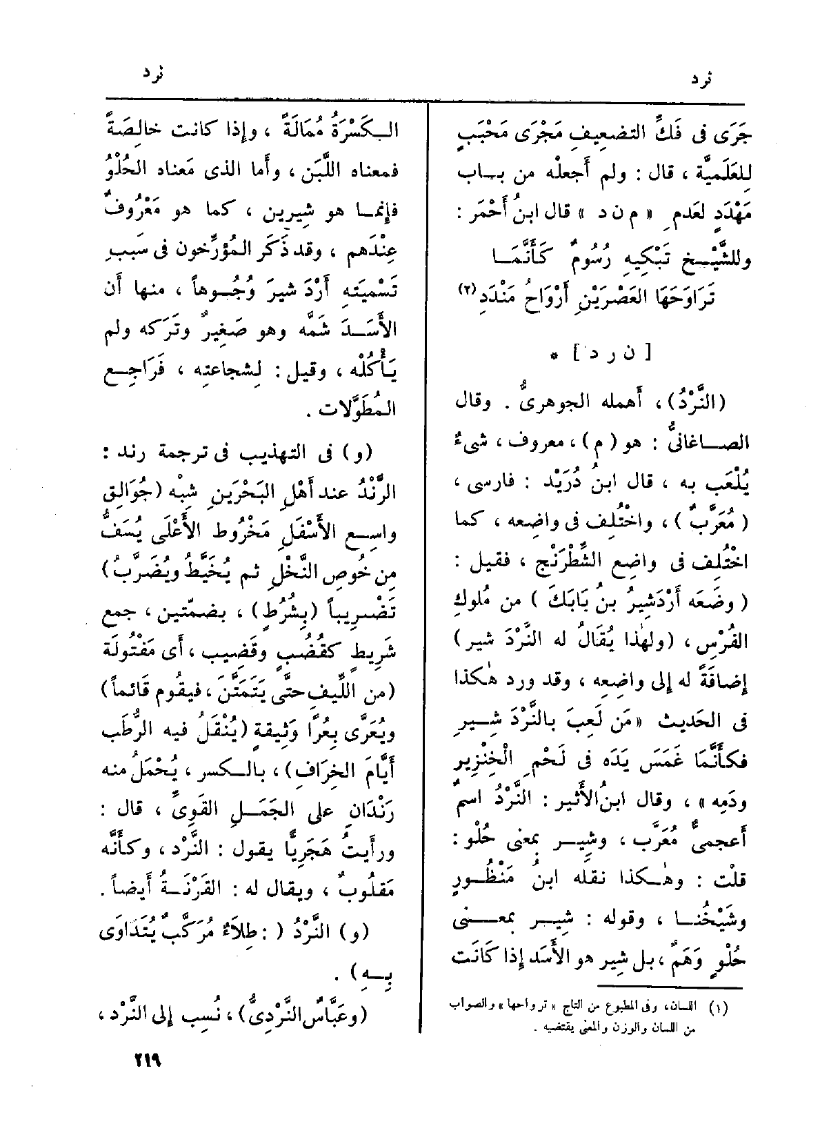 : (النَّرْدُ) ، أَهمله الجوهريُّ. وَقَالَ الصاغانيُّ: هُوَ (م) ، مَعْرُوف، شيءٌ يُلْعَب بِهِ، قَالَ ابنُ دُرَيْد: فَارسي، (مُعَرَّبٌ) ، واخْتُلِف فِي واضِعه، كَمَا اخْتُلِف فِي واضِع الشِّطْرَنْج، فَقيل: (وضَعَه أَرْدَشِيرُ بنُ بَابَكَ) من مُلوكِ الفُرْسِ، (ولهاذا يُقَالُ لَهُ النَّرْدَ شير) إِضافةً لَهُ إِلى واضِعِه، وَقد ورد هاكذا فِي الحَدِيث (مَن لَعِبَ بالنَّرْدَ شِيرِ فكأَنَّمَا غَمَسَ يَدَه فِي لَحْمِ الْخِنْزِير ودَمِه) ، وَقَالَ ابنُ الأَثير: النَّرْدُ اسمٌ أَعجميٌّ مُعَرَّب، وشِير بِمَعْنى حُلْو: قلْت: وهاكذا نقلَه ابنُ مَنْظُورٍ وشَيْخُنا، وَقَوله: شِير بِمَعْنى حُلْوٍ وَهَمُ، بل شِير هُوَ الأَسَد إِذا كَانَت الكَسْرَةُ مُمَالَةً، وإِذا كَانَت خالِصَةً فَمَعْنَاه اللَّبَن، وأَما الَّذِي مَعناه الحُلْوُ فإِنما هُوَ شِرين، كَمَا هُوَ مَعْرُوفٌ عِنْدَهم، وَقد ذَكَر المُؤرِّخون فِي سَببِ تَسْمِيَتِه أَرْدَ شيرَ وُجُوهاً، مِنْهَا أَن الأَسَدَ شَمَّه وَهُوَ صَغِيرٌ وتَرَكه وَلم يَأْكُلْه، وَقيل: لِشجاعتِه، فَوَجِع المُطَوَّلات.