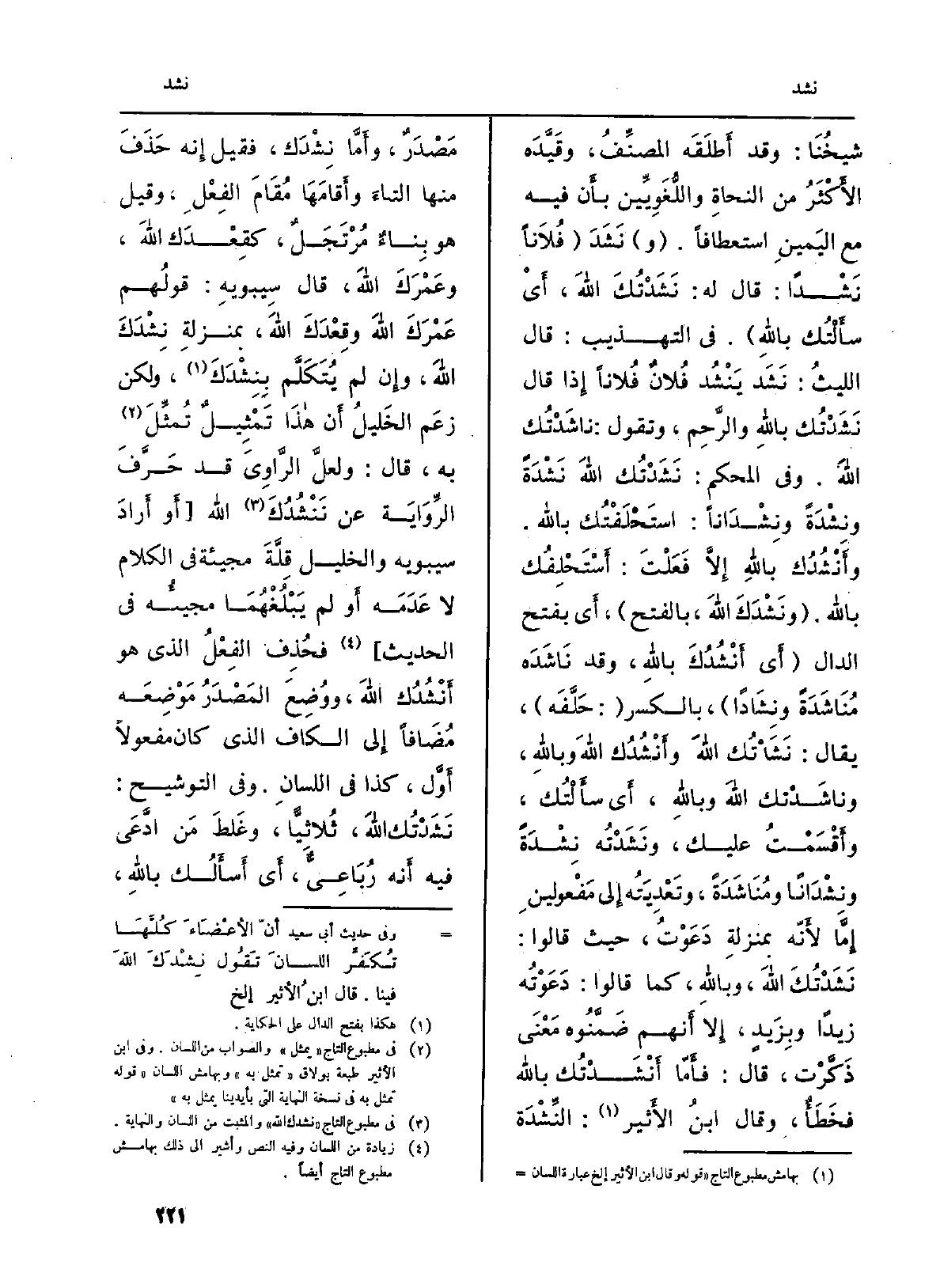 شيخُنَا: وَقد أَطلَقَه المصنِّفُ، وقَيَّدَه الأَكْثَرُ من النحاةِ واللُّغَوِيِّين بأَن فِيهِ مَعَ اليَمِينِ استعطافاً. (و) نَشَدَ (فُلاَناً نَشْداً: قَالَ لَهُ: نَشَدْتُكَ الله، أَيْ سأَلْتُك بِاللَّه) . فِي التَّهْذِيب: قَالَ الليثُ: نَشَد يَنْشُد فُلانٌ فُلاناً إِذا قَالَ نَشَدْتُك بِاللَّه والرَّحِم، وَتقول: ناشَدْتُكَ الله. وَفِي الْمُحكم: نَشَدْتُك الله نَشْدَةً ونِشْدَةً ونِشْدَاناً: استَحْلَفْتُك بِاللَّه. وأَنْشُدُك بِالله إِلاَّ فَعَلْتَ: أَسْتَحْلِفُك بِاللَّه. (ونَشْدَكَ الله، بِالْفَتْح) ، أَي بِفَتْح الدَّال (أَي أَنْشُدُكَ بِاللَّه، وَقد نَاشَدَه مُنَاشَدَةً ونِشَاداً) ، بِالْكَسْرِ (: حَلَّفَه) ، يُقَال: نَشَأْتُك الله وأَنْشُدُك الله وَبِاللَّهِ، وناشَدْتك الله وَبِاللَّهِ، أَي سأَلْتُك، وأَقْسَمْتُ عَلَيْك، ونَشَدْتُه نِشْدَةً ونِشْدَاناً ومُنَاشَدَةً، وتَعْدِيَتُه إِلى مَفْعولينِ إِمَّا لأَنّه بمنزلةِ دَعَوْتُ، حَيْثُ قَالُوا: نَشْدْتُكَ الله، وَبِاللَّهِ، كَمَا قَالُوا: دَعَوْتُه زيدا وبِزَيدٍ، إِلا أَنهم ضَمَّنُوه مَعْنَى ذَكَّرْت، قَالَ: فأَمّا أَنْشَدْتُك بِاللَّه فخَطَأٌ، وَقَالَ ابنُ الأَثير: النِّشْدَة مَصْدَرق، وأَمَّا نِشْدَك، فَقيل إِنه حَذَفَ مِنْهَا التاءَ وأَقامَهَا مُقَامَ الفِعْلِ، وَقيل هُوَ بِناءٌ مُرْتَجَلٌ، كقِعْدَك الله، وعَمْرَكَ الله، قَالَ سِيبويهِ: قولُهم عَمْرَكَ الله وقِعْدَكَ الله، بمنزلةِ نِشْدَكَ الله، وإِن لم يُتَكَلَّم بِنِشْدَكَ، وَلَكِن زعَم الخَليلُ أَن هاذَا تَمْثِيلٌ تُمثِّلَ بِهِ، قَالَ: ولعلَّ الرَّاوِيَ قد حَرَّفَ الرِّوَايَة عَن نَنْشُدُكَ الله (أَو أَرادَ سِيبَوَيْهٍ، والخليل قِلَّةَ مجيئة فِي الْكَلَام لَا عَدَمَه أَو لم يَبْلُغْهُمَا مجيئُه فِي الحَدِيث) فحُذِف الفِعْلُ الَّذِي هُوَ أَنْشُدُك الله، ووُضِعَ المَصْدَرُ مَوْضِعَه مُضَافاً إِلى الْكَاف الَّذِي كَانَ مَفعولاً أَوَّل، كَذَا فِي اللسانِ. وَفِي التوشيح: نَشَدْتُك الله، ثُلاثِيًّا، وغَلطَ مَن ادَّعَى فِيهِ أَنه رُبَاعِيٌّ، أَي أَسأَلُكَ بِاللَّه،