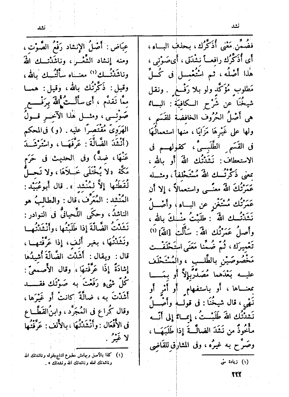 فضُمِّن مَعْنى أُذَكِّرُك، بِحَذْف الباءِ، أَي أُذَكِّرُك رافِعاً نِشْدَتي، أَي صَوْتِي، هاذا أَصْلُه، ثمَّ استُعْمِل فِي كُلِّ مَطلوبغ مُؤَكَّدٍ وَلَو بِلَا رَفْعٍ. وَنقل شيخُنَا عَن شَرْحِ الكافِيَة: الباءُ هِيَ أَصْلُ الحُرُوف الخافِضَة للقَسَمِ، وَلها على غَيْرِهَا مَزَايَا، مِنْهَا استعمالُهَا فِي القَسَمِ الطَّلَبِيِّ، كَقَوْلِهِم فِي الاستعطاف: نَشَدْتُك الله أَو بِاللَّه، بِمَعْنى ذَكَّرْتُك الله مُسْتَحْلفاً، وَمثله عَمَرْتُكَ الله معنى واستعمالاً، إِلا أَن عَمَرْتُك مُسْتَغْنٍ عَن الباءِ، وأَصْلُ نَشَدْتُك الله: طلَبْتُ مِنْك بِاللَّه، وأَصلُ عَمَرْتُك الله: سَأَلْت (الله) تَعْمِيرَك، ثُمّ ضُمِّنا مَعَنَى استَحْلَفْت مَخْصُوصَيْنِ بالطَّلبِ، والمُسْتَحْلَف عَلَيْهِ بَعْدَهما مُصَدَّرٌ بِإِلاَّ أَو بِمَا بِمَعْنَاهُ، أَو باستفهامٍ أَو أَمْرٍ أَو نَهْيٍ، قَالَ شيخُنَا: فِي قَوْله وأَصْلُ نَشدْتُك الله طَلَبْتُ، إِيماءٌ إِلى أَنّه مأْخُوذٌ من نَشَدَ الضَّالَةَ إِذا طَلَبَهَا، وصَرَّح بِهِ غيرُه، وَفِي المشارقِ للقَاضِي عِيَاض: أَصْلُ الإِنشاد رَفْعُ الصَّوْتِ، وَمِنْه إِنشاد الشِّعْر، وناشَدْتك الله وناشَدْتُك مَعْنَاهُ سأَلْتُك بِاللَّه، وَقيل: ذَكَّرْتُك بِاللَّه، وَقيل: هما ممَّا تَقدصم، أَي سأَلْتُ الله بِرَفْعِ صَوْتِي، وَمثل هاذا الآخِرِ قولُ الهَرَوِيّ مُقْتَصِراً عَلَيْهِ. (و) فِي الْمُحكم (أَنْشَدَ الضَّالَّةَ: عَرَّفَهَا، واسْتَرْشَدَ عَنْهَا، ضِدٌّ) وَفِي الحَدِيث فِي حَرَمٍ مَكَّة (لَا يُخْتَلَى خَلاَهَا، وَلَا تَحِلُّ لُقَطَتُها إِلاص لِمُنْشِدٍ) . قَالَ أَبو عُبَيْد: المُنْشِد: المُعَرِّف، قَالَ: والطالِبُ هُوَ الناشِدُ، وحكَى اللِّحيانيُّ فِي النَّوَادِر: نَشَدْتُ الضَّالَةَ إِذا طَلَبْتُها، وأَنْشَدْتُها ونَشَدْتُهَا، بِغَيْر أَلِفٍ، إِذا عَرَّفْتها، قَالَ: وَيُقَال: أَشَدْت الضَّالّةَ أُشِيدُها إِشادَةً إِذَا عَرَّفْتهَا، وَقَالَ الأَصمعيّ: كخلّ شيحءٍ رَفَعحتَ بِهِ صَوْتَك فقد أَشَدْتَ بِهِ، ضالَّةً كانتْ أَو غَيْرَها، وَقَالَ كُراع فِي المُجَرَّد، وابنُ القَطَّاع فِي الأَفْعَال: وأَنْشَدْتُهَا، بالأَلف: عَرَّفْتُها لَا غَيْرُ.