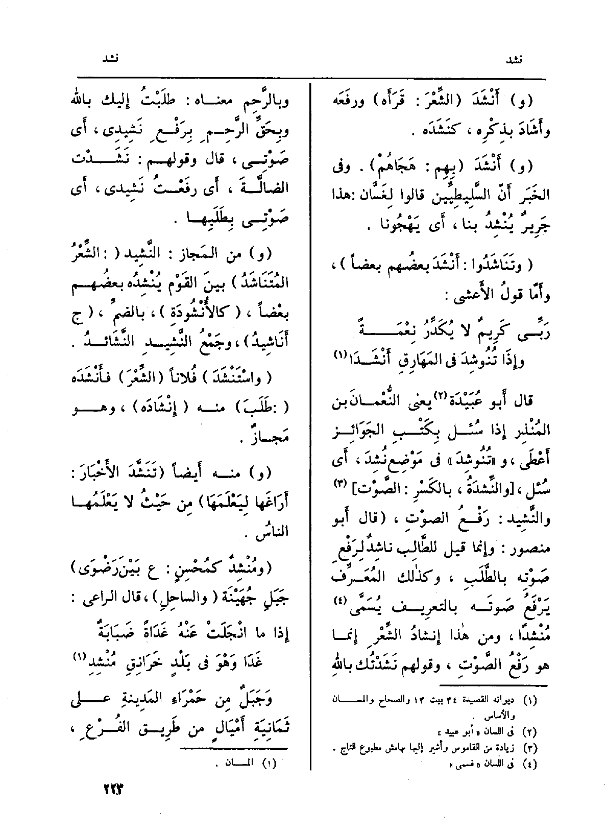 قَالَ أَبو عُبَيْدَة يَعْنِي النُّعْمَانَ بن المُنْذِر إِذا سُئل بِكَتْبِ الجَوَائِز أَعْطَى، و (تُنُوشِدَ) فِي مَوْضِع نُشِدَ، أَي سُئل، (والنِّشدَةُ، بالكَسْرِ: الصَّوْت) والنَّشِيد: رَفْعُ الصوْتِ، (قَالَ) أَبو مَنْصُور: وإِنما قيل للطَّالِب ناشِدٌ لِرَفْعِ صَوْتِه بالطَّلَبِ، وكذالك المُعَرِّفَ يَرْفَعُ صَوتَه بالتعرِيف يُسَمَّى مُنْشِداً، وَمن هَذَا إِنشادُ الشِّعْرِ إِنما هُوَ رَفْعُ الصَّوْتِ، وَقَوْلهمْ نَشَدْتُك بِاللَّه بالرَّحِم مَعْنَاهُ: طلَبْتُ إِليك بِاللَّه وبِحَقِّ الرَّحِمِ بِرَفْعِ نَشِيدِي، أَي صَوْتِي، قَالَ وَقَوْلهمْ: نَشَدْت الضالَّةَ، أَي رفَعْتُ نَشِيدي، أَي صَوحتِي بِطَلَبِها.