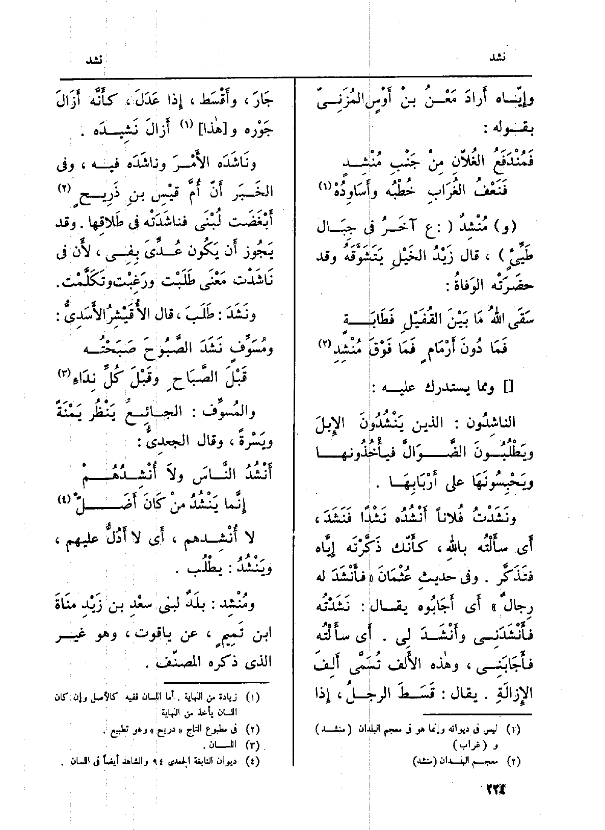 ونَشَدْتُ فُلاناً أَنْشُدُه نَشْداً فَنَشَدَ، أَي سأَلْتُه بِاللَّه، كأَنّك ذَكَّرْتَه إِيَّاه فتَذَكَّر. وَفِي حديثِ عُثْمَانَ (فأَنْشَدَ لَهُ رِجالٌ) أَي أَجَابُوه يُقَال: نَشَدْتُه فأَنْشَدَنِي وأَنْشَدَ لِي. أَي سأَلْتُه فأَجَابَنِي، وهاذه الأَلف تُسَمَّى أَلِفَ الإِزَالَةِ. يُقَال: قَسَطَ الرجلُ، إِذا جَارَ، وأَقْسَط، إِذا عَدَلَ، كأَنَّه أَزَالَ جَوْره و (هاذا) أَزالَ نَشِيدَه.
