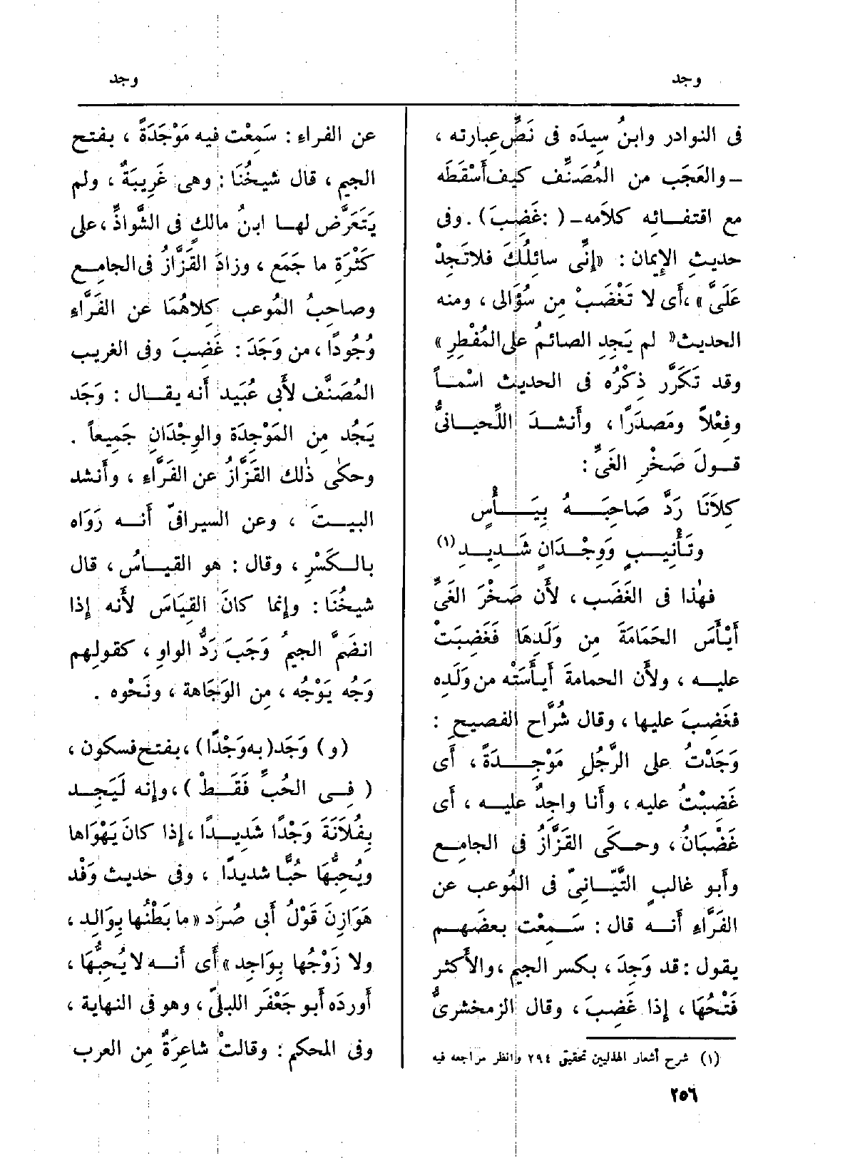 فهاذا فِي الغَضَب، لأَن صَخْرَ الغَيِّ أَيْأَسَ الحَمَامَةَ مِن وَلَدِهَا فَغَضِبَتْ عَلَيْهِ، ولأَن الحمامةَ أَيأَسَتْه من وَلَده فغَضِبَ عَلَيْهَا، وَقَالَ شُرَّاح الفصيحِ: وَجَدْتُ على الرَّجُلِ} مَوْجِدَةً، أَي غَضِبْتُ عَلَيْهِ، وأَنا {واجِدٌ عَلَيْهِ، أَي غَضْبَانُ، وحكَى القَزَّازخ فِي الجامِع وأَبو غالبٍ التَّيّانِيّ فِي المُوعب عَن الفَرَّاءِ أَنه قَالَ: سَمِعْت بعضَهم يَقُول: قد} وَجِدَ، بِكَسْر الْجِيم، والأَكثر فَتْحُهَا، إِذا غَضِبَ، وَقَالَ الزمخشريُّ عَن الفراءِ: سَمِعْت فِيهِ {مَوْجَدَةً، بِفَتْح الْجِيم، قَالَ شيخُنَ: وَهِي غَرِيبَةٌ، وَلم يَتَعَرَّض لَهَا ابنُ مالكٍ فِي الشَّواذِّ، على كَثْرَةِ مَا جَمَع، وزادَ القَزَّازخ فِي الجامِع وصاحبُ المُوعب كِلاهُمَا عَن الفَرَّاءِ} وُجُوداً، من {وَجَدَ: غَضِبَ وَفِي الْغَرِيب المُصَنَّف لأَبي عُبَيد أَنه يُقَال: وَجَد} يَجُد مِن {المَوْجِدَة} والوِجْدَانِ. جَمِيعاً. وَحكى ذالك القَزَّازُ عَن الفَرَّاءِ، وأَنشد البيتَ، وَعَن السيرافيّ أَنه رَوَاه بالكَسْرِ، وَقَالَ: هُوَ القياسُ، قَالَ شيخُنَا: وإِنما كانَ القِيَاسَ لأَنه إِذا انضَمَّ الجيمُ وَجَبَ رَدُّ الواوِ، كقولِهم وَجُه يَوْجُه، مِن الوَجَاهة، ونَحْوه.