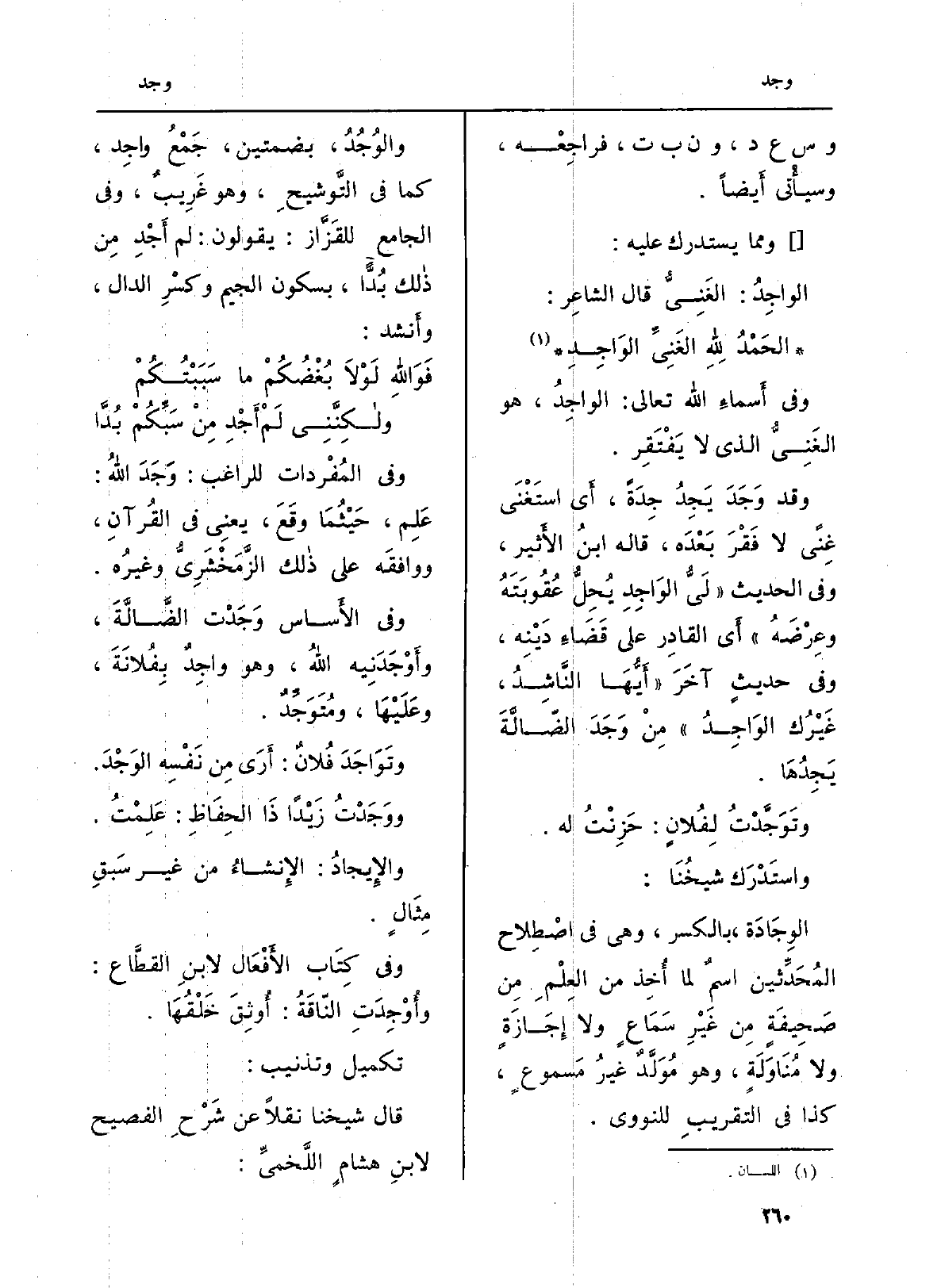 } الوِجَادَةَ، بِالْكَسْرِ، وَهِي فِي اصْطِلاح المُحَدِّثين اسمٌ لما أُخِذ من العِلْمِ مِن صَحِيفَةٍ مِن غَيْرِ سَمَاعٍ وَلَا إِجَازَةٍ وَلَا مُنَاوَلَةٍ، وَهُوَ مُوَلَّدٌ غيرُ مَسموعٍ، كَذَا فِي التقريبِ للنووي.