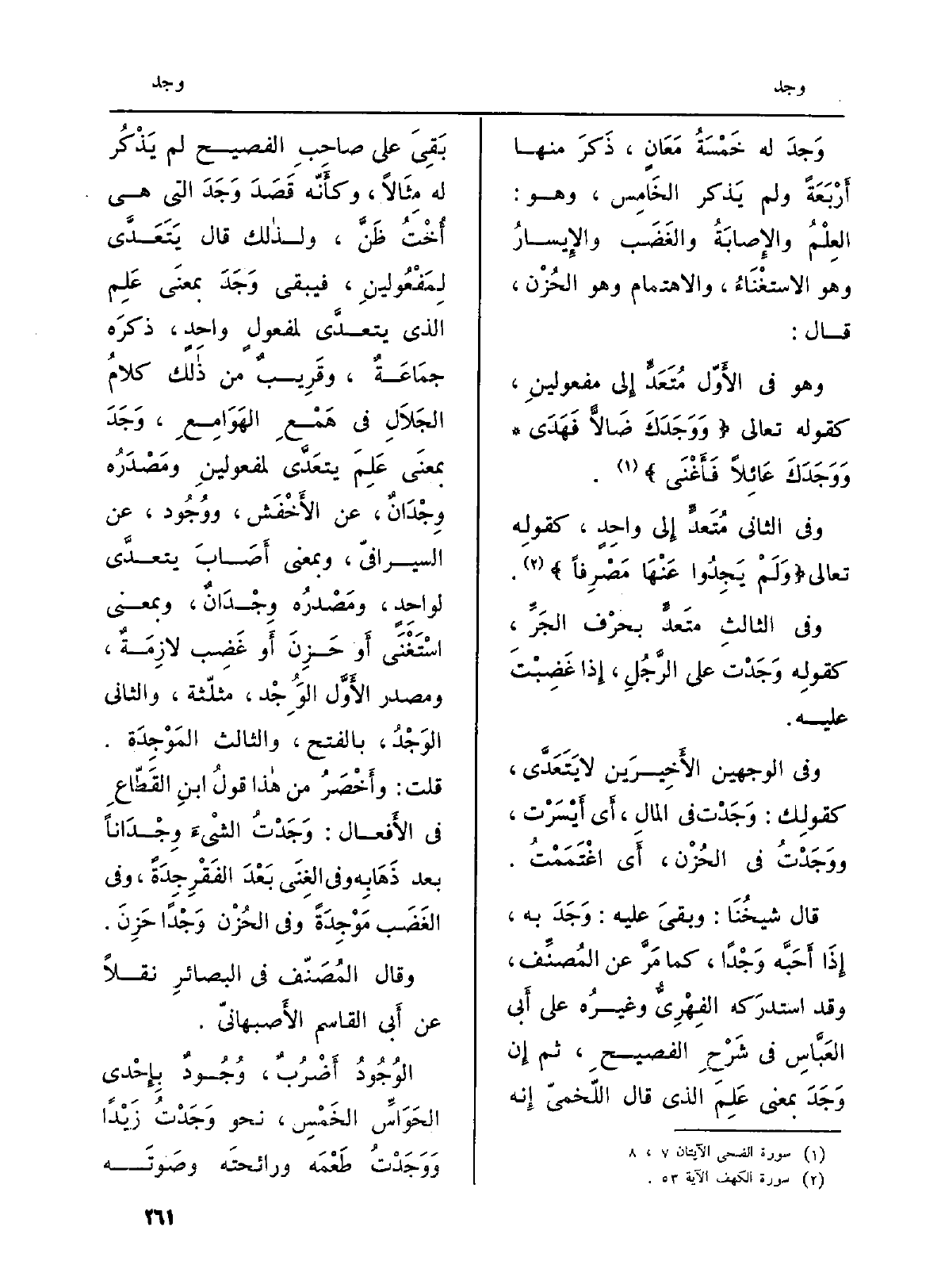 {الوُجُودُ أَضْرُبٌ،} وُجُودٌ بِإِحْدَى الحَوَاسِّ الخَمْسِ، نَحْو {وَجَدْتُ زَيْداً} وَوَجَدْتُ طَعْمَه ورائحتَه وصَوتَه