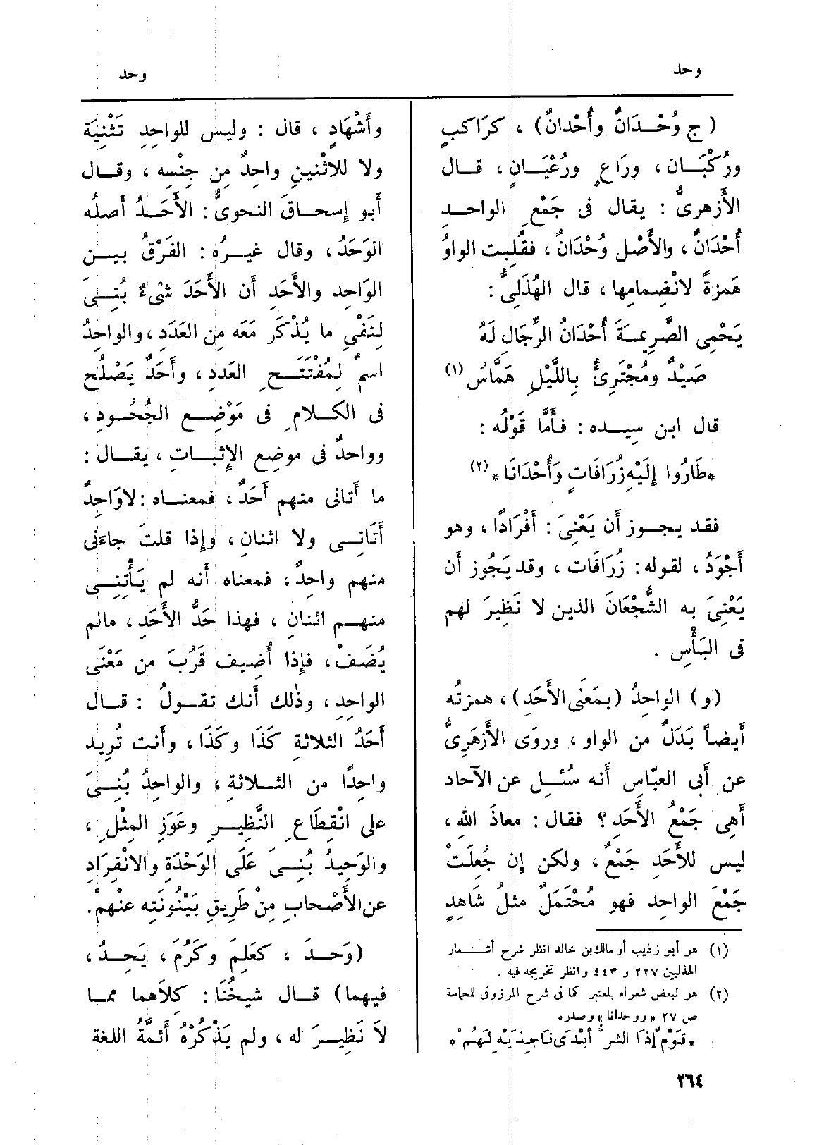 (و) الواحِدُ (بمَعنَى الأَحَدِ) ، همزتُه أَيضاً بَدَلٌ من الْوَاو، وروَى الأَزهَرِيُّ عَن أَبي العبّاسِ سُئلِ عَن {الْآحَاد أَهِي جَمْعُ} الأَحَدِ؟ فَقَالَ: معاذَ الله، لَيْسَ {للأَحَدِ جَمْعٌ، وَلَكِن إِن جُعِلَتْ جَمْعَ الواحِد فَهُوَ مُحْتَمَلٌ مثلُ شَاهِدٍ وأَشْهَادٍ، قَالَ: وَلَيْسَ للواحِدِ تَثْنِيَة وَلَا للاثْنينِ واحِدٌ مِن جِنْسِه، وَقَالَ أَبو إِسحاقَ النحويُّ:} الأَحَدُ أَصلُه {الوَحَدُ، وَقَالَ غيرُه: الفَرْقُ بَين} الوَاحِد {والأَحَدِ أَن} الأَحَدَ شيْءٌ بُنِيَ لِنَفْيِ مَا يُذْكَر مَعَه مِن العَدَده، والواحِدُ اسمٌ لمُفْتَتَحِ العَددِ، {وأَحَدٌ يَصْلُح فِي الكلامِ فِي مَوْضِع الجُحُودِ، وواحِدٌ فِي موضِع الإِثباتِ، يُقَال: مَا أَتاني مِنْهُم أَحَدٌ، فَمَعْنَاه: لَا} وَاحِدٌ أَتَانِي وَلَا اثنانِ، وإِذا قلتَ جاءَني مِنْهُم واحِدٌ، فَمَعْنَاه أَنه لم يَأْتِنِي مِنْهُم اثنانِ، فَهَذَا حَدُّ الأَحَدِ، مَا لم يُضَفْ، فإِذا أُضيف قَرُبَ من مَعْنَى الواحِدِ، وذالك أَنك تقولُ: قَالَ أَحَدُ الثلاثةِ كَذَا وكَذَا، وأَنت تُرِيد واحِداً من الثلاثةِ، والواحِدُ بُنِيَ على انْقِطَاعِ النَّظِيره وعَوَزِ المِثْلِ، {والوَحِيدُ بُنِيَ عَلَى} الوَحْدَةِ والانْفِرَادِ عَن الأَصْحابِ مِنْ طَرِيقِ بَيْنُونَتِه عنْهمْ.