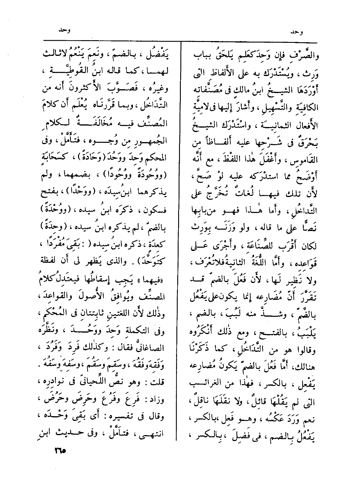 والصَّرْفِ فإِن {وَحِدَ كعَلِم يَلحَقُ بِبَاب وَرِث، ويُسْتَدْرَك بِهِ على الأَلفاظِ الَّتِي أَوْرَدَهَا الشيخُ ابنُ مالكٍ فِي مُصَنَّفاتِه الكافِيَةِ والتَّسْهِيلِ، وأَشارَ إِليها فِي لامِيَّةِ الأَفعال الثمانِيَة، واسْتَدْرَك الشيخُ بَحْرَقٌ فِي شَرْحِها عَلَيْهِ أَلفاظاً مِن القَاموس، وأَغْفَلَ هاذا اللفْظَ، مَعَ أَنَّه أَوْضَحُ مِمَّا استدْرَكه عَلَيْهِ لوْ صَحَّ، لأَن تِلْكَ فِيهَا لُغاتٌ تُخَرَّجُ على التَّداخُلِ، وأَما هاذا فَهُوَ من بابِها نَصًّا على مَا قَالَه، وَلَو وَزَنَه بِوَرِث لَكَانَ أَقْرَب للصِّنَاعَةِ، وأَجْرَى عَلى قَوَاعِدِه، وأَمَّا اللُّغَةُ الثانِيَةُ فَلَا تُعْرَف، وَلَا نَظِير لَها، لأَن فَعُلَ بالضمّ قد تَقَرَّرَ أَنّ مُضَارِعه إِنما يكون على يَفْعُل بالضَّمّ، وشذَّ مِنْهُ لَبُبَ، بِالضَّمِّ، يَلْبَبُ، بِالْفَتْح، وَمَعَ ذالك أَنْكَرُوه وَقَالُوا هُوَ من التَّدَاخُلِ، كَمَا ذَكَرْنَا هُنَالك، أَمَّا فَعُلَ بالضمّ يَكونُ مُضارِعه يَفْعِل، بِالْكَسْرِ، فهاذا من الغرائب الَّتِي لم يَقُلْهَا قائِلٌ، وَلَا نقَلَهَا ناقِلٌ د نعم وَرَدَ عَكْسُه، وَهُوَ فَعِل، بِالْكَسْرِ، يَفعُلُ بِالضم، فِي فَضِلَ، بِالكسر، يَفْضُل، بالضمّ، ونَعِمَ يَنْعُمُ لَا ثَالِث لَهما، كَمَا قَالَه ابنُ القُوطِيَّةِ، وغِيرُه، فَصَوَّبَ الأَكثرونَ أَنه من التَّدَاخُل، وَبِمَا قَررنَاه يُعْلَم أَن كلامَ المُصنِّف فِيهِ مُخَالَفعةٌ لكلامِ الجُمهورِ مِن وُجوه، فتَأَمَّلْ، وَفِي الْمُحكم} وَحِدَ {ووَحُدَ (} وَحَادَةً) ، كسَحَابَةٍ ( {ووُحُودَةً} ووُحُوداً) ، بضمهما، وَلم يذكرهما ابنُ سِيدَه، ( {ووَحْداً) ، بِفَتْح فَسُكُون، ذكرَه ابنُ سَيّده، (} ووُحْدَةً) بالضمّ، لم يذكرهُ ابنُ سَيّده، ( {وحِدَةً) كعِدَة، ذكره ابنُ سِيده (: بَقِيَ مُفْرَداً،} كتَوَحَّدَ) . وَالَّذِي يَظهر لي أَن لَفْظَة (فيهمَا) يَجِب إِسقاطُها فيعتَدِلُ كلامُ المنصِّف ويُوافِقُ الأُصولَ والقواعِدَ، وذالك لأَن اللغتين ثابِتتانِ فِي المُحْكم، وَفِي التكملة {وَحدَ} ووَحُدَ، ونَظَّرَه الصاغانيُّ فَقَالَ: وكذالك فَرِدَ وَفَرُدَ، وَفَقِهَ وفَقُهَ، وسَقِمَ وسَقُمَ، وسَفِهَ وسَفُهَ. قلت: وَهُوَ نصُّ اللِّحيانيّ فِي نوادِرِه، وَزَاد: فَرِعَ وفَرُعَ وحَرِضَ وحَرُضَ، وَقَالَ فِي تَفْسِيره: أَي بَقِيَ! وَحْدَه، انْتهى، فتأَمَّلْ، وَفِي حَدِيث ابنِ