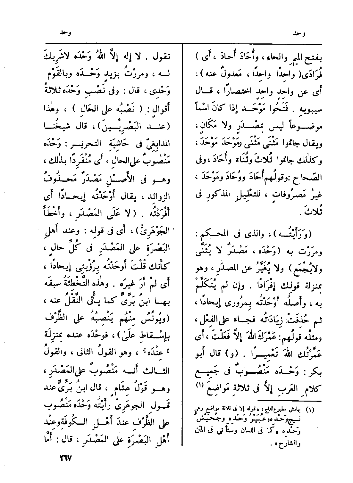 (وَرَأَيْتُه) ، وَالَّذِي فِي الْمُحكم: ومرَرْت بِهِ (} وَحْدَه، مَصْدَرٌ لَا يُثَنَّى وَلَا يُجْمَع) وَلَا يُغَيَّرُ عَن المصدَرِ، وَهُوَ بِمَنْزِلَة قَوْلك إِفْرَاداً. وإِن لم يُتَكَلَّمْ بِهِ، وأَصلُه {أَوْحَدْتُه، بِمرُوري} إِيحاداً، ثمَّ حُذِفَتْ زِيَادَاتُه فجاءَ على الفِعْل، ومثلُه قولُهم: عَمْرَكَ الله إِلاَّ فَعَلْتَ، أَي عَمَّرْتُك الله تَعْمِيراً. (و) قَالَ أَبو بكر: وَحْدَه مَنْصُوبٌ فِي جَمِيع كلامِ العَربِ إِلاَّ فِي ثلاثةِ مَواضِعَ تَقول. لَا إِله إِلاَّ الله وَحْدَه لَا شَرِيكع لَهُ، ومررْتُ بزيدٍ وَحْدَه وبالقَوْم وَحْدِي، قَالَ: وَفِي نَصْبِ وَحْدعه ثلاثةُ أَقوالٍ: (نَصْبُه على الحَالِ) ، وهاذا (عِنْد البَصْرِيِّينَ) ، قَالَ شيخُنا المدابِغِيّ فِي حَاشِيَةِ التَّحْرِير: وَحْدَه مَنْصُوبٌ على الحالِ، أَي مُنْفَرِداً بذالك، وَهُوَ فِي الأَصْلِ مَصْدَرٌ مَحْذُوفُ الزوائِد، يُقَال {أَوحَدْتُه} إِيحاداً أَي أَفْرَدْتُه. (لَا عَلَى المَصْدَرِ، وأَخْطَأَ الجَوْهَرِيُّ) ، أَي فِي قولِه: وَعند أَهلِ البَصْرَةِ على المَصْدَرِ فِي كُلِّ حالٍ، كأَنك قُلْتَ أَوحَدْتُه بِرُؤْيتِي إِيحاداً، أَي لمْ أَرَ غيرَه. وهاذه التَّخْطِئَةُ سبقَه بهَا ابنُ بَرِّيَ كَمَا يأْتي النَّقْلُ عَنهُ، (ويُونُسُ مِنْهُم يَنْصِبُهُ على الظَّرْف بإِسْقاطِ عَلَى) ،! فوحْدَه عِنْده بمنزِلَة (عنْدَه) ، وَهُوَ القولُ الثَّانِي، والقولُ الثَّالِث أَنه مَنْصُوبٌ على المَصْدَرِ، وَهُوَ قَوْلُ هِشَامٍ، قَالَ ابنُ بَرِّيَ عِنْد قَولِ الجوهَرِيّ رأَيْتُه وَحْدَه مَنْصُوب على الظَّرْفِ عندَ أَهْلِ الكُوفَةِ وعِنْد أَهْلِ البَصْرَةِ على المَصْدَره، قَالَ: أَمَّا