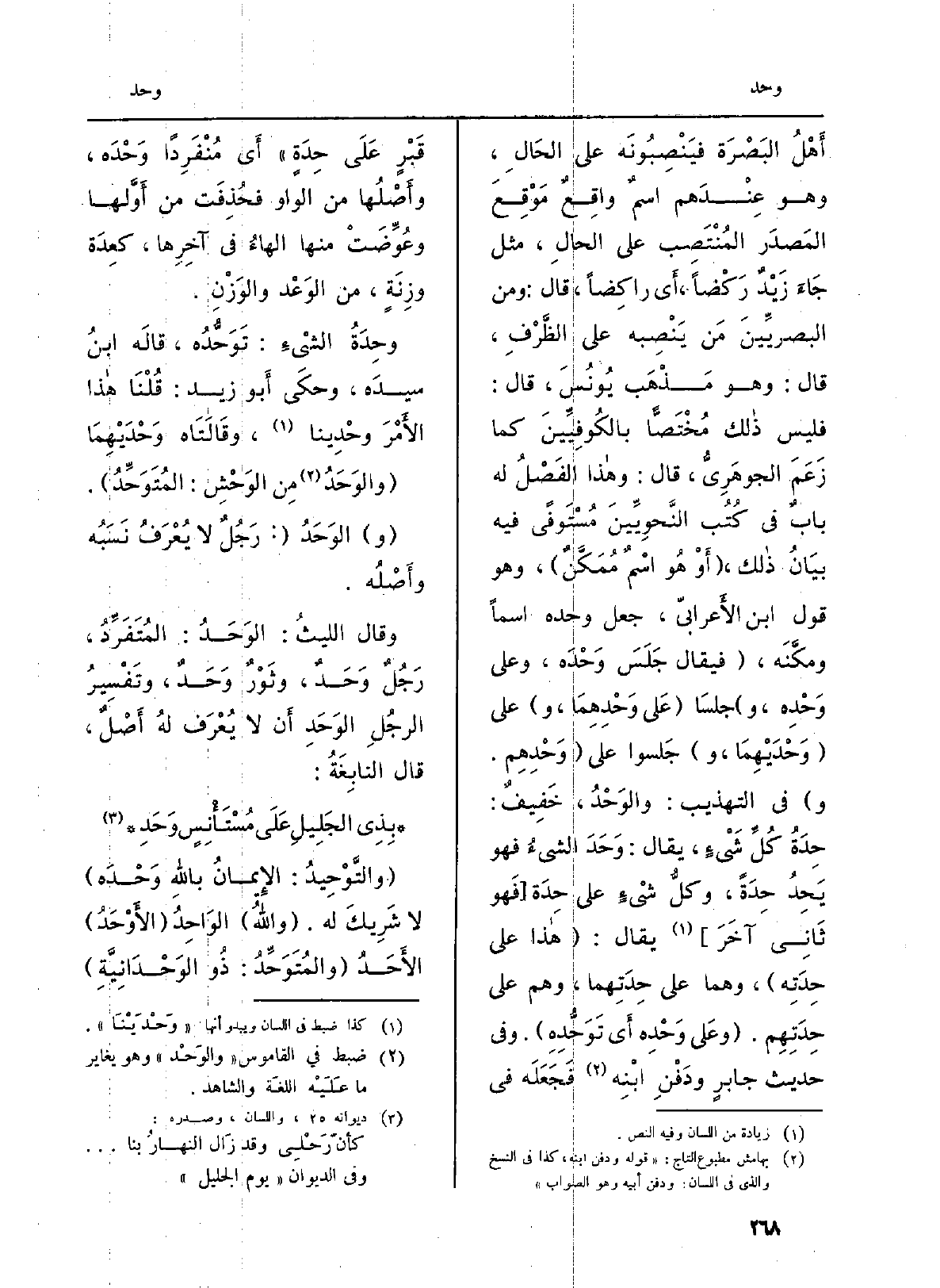أَهْلُ البَصْرَةَ فيَنْصِبُونَه على الحَالِ، وَهُوَ عِنْدَهم اسمٌ واقِعٌ مَوْقِعَ المَصدَر المُنْتَصِب على الحالِ، مثل جَاءَ زَيْدٌ رَكْضاً، أَي راكِضاً، قَالَ: وَمن البصريِّينَ مَن يَنْصِبه على الظَّرْفِ، قَالَ: وَهُوَ مَذْهَب يُونُسَ، قَالَ: فَلَيْسَ ذالك مُخْتَصًّا باكلُوفِيِّينَ كَمَا زَععمَ الجوهَرِيُّ، قَالَ: وهاذا الفَصْلُ لَهُ بابٌ فِي كُتُب النَّحوِيِّينَ مُسْتَوفًى فِيهِ بيَانُ ذالك، (أَوْ هُو اسْمٌ مُمَكَّنٌ) ، وَهُوَ قَول ابْن الأَعرابيّ، جعل وَحده اسْما ومكَّنَه، (فَيُقَال جَلَسَ وَحْدَه، وعَلى وَحْدِ، و) جلسَا (عَلى {وَحْدِهِمَا، و) على (} وَحْدَيْهِمَا، و) جَلسوا على ( {وَحْدِهِم. و) فِي التَّهْذِيب:} والوَحْدُ، خَفِيفٌ: {حِدَةُ كُلِّ شَيْءٍ، يُقَال: وَحَدَ الشيءُ فَهُوَ} يَحِدُ {حِدَةً، وكلُّ شيْءٍ على} حِدَة (فَهو ثَانِي آخَرَ) يُقَال: (هاذا على {حِدَتِه) ، وهما على حِدَتِهما، وهم على} حِدَتِهِم. (وعَلى {وَحْدِه أَي} تَوَحُّدِهِ) . وَفِي حَدِيث جابرٍ ودَفْنِ ابْنِه فَجَعَلَه فِي قَبْرٍ عَلَى {حِدَةٍ) أَي مُنْفَرِداً} وَحْدَه، وأَصْلُها من الْوَاو فحُذِفَت من أَوَّلها وعُوِّضَتْ مِنْهَا الهاءُ فِي آخِرِها، كعِدَة وزِنَةٍ، من الوَعْد والوَزْنِ.