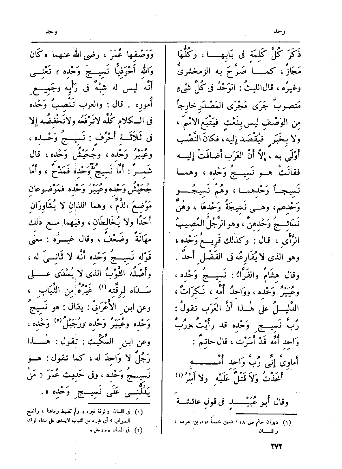ذَكَرَ كُلَّ كَلِمَةٍ فِي بَابِها، وكُلُّهَا مَجَازٌ، كَمَا صَرَّحَ بِهِ الزمخشريُّ وغيرُه، قَالَ الليثُ: الوَحْدُ فِي كُلِّ شيْءٍ مَنصوبٌ جَرَى مَجْرَى المَصْدَرِ خارِجاً مِن الوَصْفِ لَيْسَ بِنَعْتٍ فيَتْبَع الاسْمَ، وَلَا بِخَبَرٍ فيُقْصَد إِليه، فكانَ النَّصْب أَوْلَى بِهِ، إِلاّ أَنّ العَرعب أَضافَتْ إِليه فقالَتْ هُوَ نَسِيجُ وَحْدِه، وهما نَسِيجاً {وَحْدِهما، وهُمْ نَسِيجُو} وَحْدِهم، وَهِي نَسِيجَةُ {وَحْدِهَا، وهُنَّ نَسَائِجُ} وَحْدِهِنَّ، وَهُوَ الرَّجُلُ المُصِيبُ الرَّأْيِ، قَالَ: وكذالك قَرِيعُ وَحْدِه، وَهُوَ الَّذِي لَا يُقَارِعُه فِي الفَضْلِ أَحدٌ. وَقَالَ هِشَامٌ والفَرَّاءُ: نَسِيجُ وَحْدِه، وعُيَيْرُ وَحْدِه،! ووَاحِدُ أُمِّهِ، نَكِرَاتٌ، الدَّليلُ على هاذا أَنَّ العَرَب تقولُ: رُبَّ نَسِيجِ وَحْدِه قد رأَيْتُ، ورُبَّ وَاحِدِ أُمِّه قَدْ أَسَرْت، قَالَ حاتِمٌ: