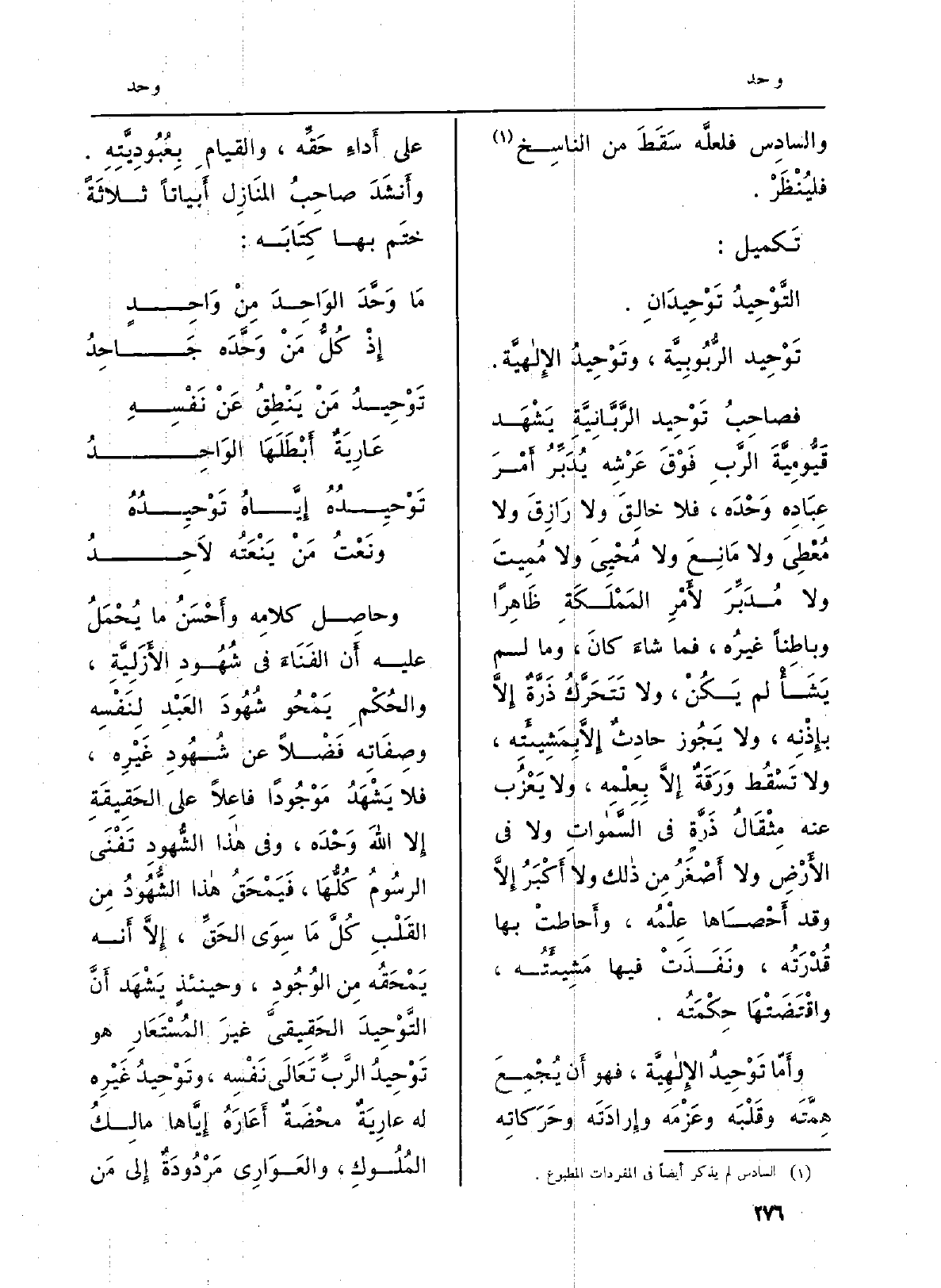 وأَمّا تَوْحِيدُ الإِلاهِيَّة، فَهُوَ أَن يُجْمِعَ هِمَّتَه وقَلْبَ وعَزْمَه وإِرادَتَه وحَرَكاتِه على أَداءِ حَقِّه، والقيامِ بِعُبُودِيَّتِه. وأَنْشَدَ صاحِبُ المنَازِل أَبياناً ثلاثَةً ختَم بهَا كِتَابَه: