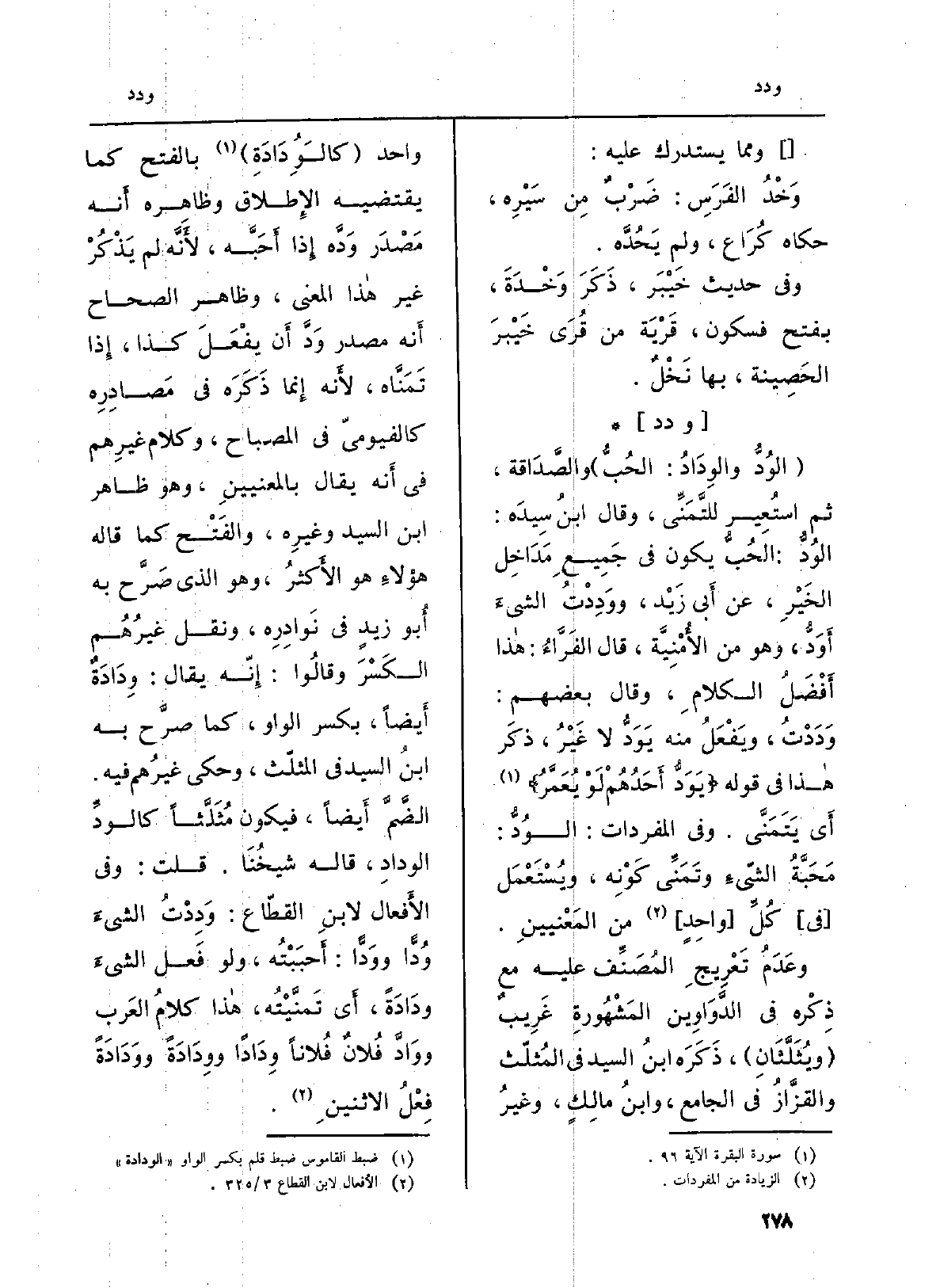 : (} الوُدُّ {والوِدَادُ: الحُبُّ) والصَّدَاقة، ثمَّ استُعِير للتَّمَنِّي، وَقَالَ ابنُ سِيدَه: الوُدُّ: الحُبُّ يكون فِي جَمِيعِ مَدَاخِل الخَيْرِ، عَن أَبي زَيْد،} ووَدِدْتُ الشيءَ {أَوَدُّ، وَهُوَ من الأُمْنِيَّة، قَالَ الفَرَّاءُ: هاذا أَفْضَلُ الكلامِ، وَقَالَ بَعضهم:} وَدَدْتُ، ويَفْعَلُ مِنْهُ {يَوَدُّ لَا غَيْرُ، ذكَر هاذا فِي قَوْله: {يَوَدُّ أَحَدُهُمْ لَوْ يُعَمَّرُ} (سُورَة الْبَقَرَة، الْآيَة: 96) أَي يَتَمَنَّى. وَفِي الْمُفْردَات: الوُدُّ: مَحَبَّةُ الشيءِ وتَمَنِّي كَوْنِه، ويُسْتَعْمَل (فِي) كُلِّ (واحِدٍ) من المَعْنيينِ.