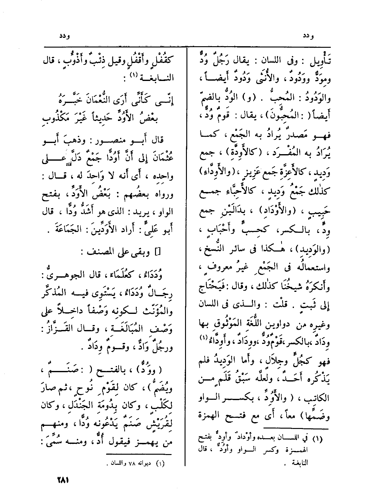 تَأْوِيل: وَفِي اللِّسَان: يُقَال رَجُلٌ {وُدٌّ} ومِوَدٌّ {ووَدُودٌ، والأُنَثَى} وَدُودٌ أَيضاً، {والوَدُودُ: المُحِبُّ. (و) } الوُدُّ بالضمّ أَيضاً (: المُحِبُّونَ) ، يُقَال: قَومٌ {وُدٌّ، فَهُوَ مَصدرٌ يُرادُ بِهِ الجَمْع، كَمَا يُرَادُ بِهِ المُفْرَد، (} كالأَوِدَّةِ) ، جمع {وَدِيدٍ، كالأَعِزَّةِ جَمع عَزِيزٍ، (} والأَوِدَّاءِ) كذالك جَمْعُ {وَدِيدٍ، كالأَحِبَّاءِ جمع حَبِيبٍ، (} والأَوْدَادِ) ، بدَالَيْنِ جمع {وِدٍّ، بِالْكَسْرِ، كحِبَ وأَحْبَابٍ، (والوَدِيدِ) ، هاكذا فِي سَائِر النُّسخ، واستعمالُه فِي الجَمْعِ غيرُ معروفًّ، وأَنكرَهُ شيخُنَا كذالك، وَقَالَ: فَيَحْتَاج إِلى ثَبتًّ. قلْت: وَالَّذِي فِي اللِّسَان وغيرِه من دواوين اللُّغَةِ المَوْثُوقِ بهَا} وِدَادٌ، بِالْكَسْرِ، قَوْمٌ {وُدٌّ،} ووِدَادٌ، {وأَوِدَّاءُ فَهُوَ كجُلَ وجِلاَلٍ، وأَما الوَدِيدُ فَلم يَذْكُره أَحَدٌ، ولعلَّه سَبْقُ قَلَمٍ من الكاتِب، (} والأَوُدِّ، بِكَسْر الْوَاو وضَمِّها) مَعًا، أَي مَعَ فتح الْهمزَة كقُفْلٍ وأَقْفُلٍ وَقيل ذِئْبٌ وأَذْؤُبٍ، قَالَ النَّابِغَة: