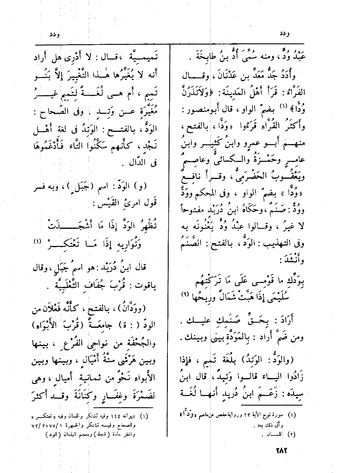 } وأُدَدُ جَدُّ مَعَدِّ بن عَدْنَانَ، وَقَالَ الفَرَّاءُ: قَرَأَ أَهْلُ المَدِينَة: {وَلاَ تَذَرُنَّ وَدّاً} (سُورَة نوح، الْآيَة: 23) بضمّ الْوَاو، قَالَ أَبو مَنْصُور: وأَكثَرُ القُرَّاءِ قَرَؤُوا (وَدًّا، بِالْفَتْح، مِنْهُم أَبو عمرٍ ووابنُ كَثِير وابنُ عامِرٍ وحَمْزَةُ والكسائيُّ وعاصِمٌ ويَعْقُوبُ الحَضْرَمِيُّ، وقرأَ نافِعٌ ( {وُدًّا) بضمّ الْوَاو، وَفِي الْمُحكم} ووَدٌّ {ووُدٌّ: صَنَمٌ، وحَكَاهُ ابنُ دُرَيْدٍ مَفْتُوحًا لَا غيرُ، وَقَالُوا عبْدُ وُدَ يَعْنُونَه بِهِ وَفِي التَّهْذِيب: الوَدُّ، بِالْفَتْح: الصَّنَمُ وأَنْشَدَ: