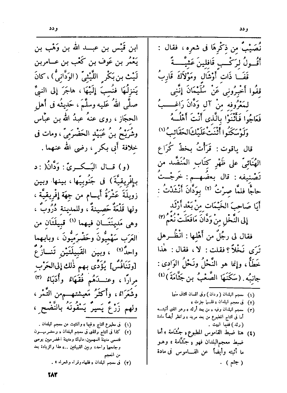 قَالَ ياقوت: قَرَأْتُ بخطّ كُرَاع الهُنَائِيّ على ظَهْرِ كِتَابِ المُنَضَّد من تَصْنِيفه: قَالَ بعضُهم: خَرجْتُ حاجًّا فلمَّا صِرْتُ} بِوَدَّانَ أَنْشَدْتُ: