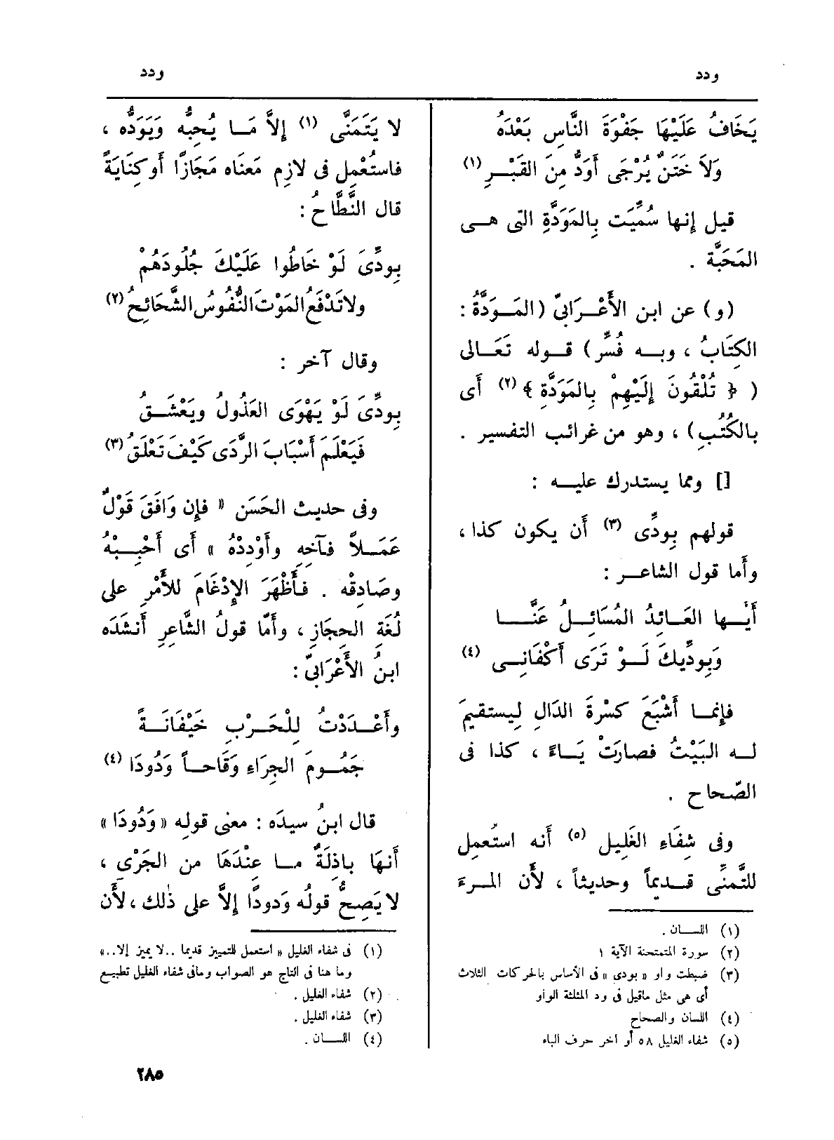 تَابع كتاب وَفِي شِفَاءٍ الغَلِيل أَنه استُعمِل للتَّمنِّي قَدِيما وحديثاً، لأَن المرءَ لَا يَتَمَنَّى إِلاَّ مَا يُحِبُّه} وَيَوَدُّه، فاستُعْمِل فِي لازِم مَعنَاه مَجَازاً أَو كِنَايَةً قَالَ النَّطَّاحُ: