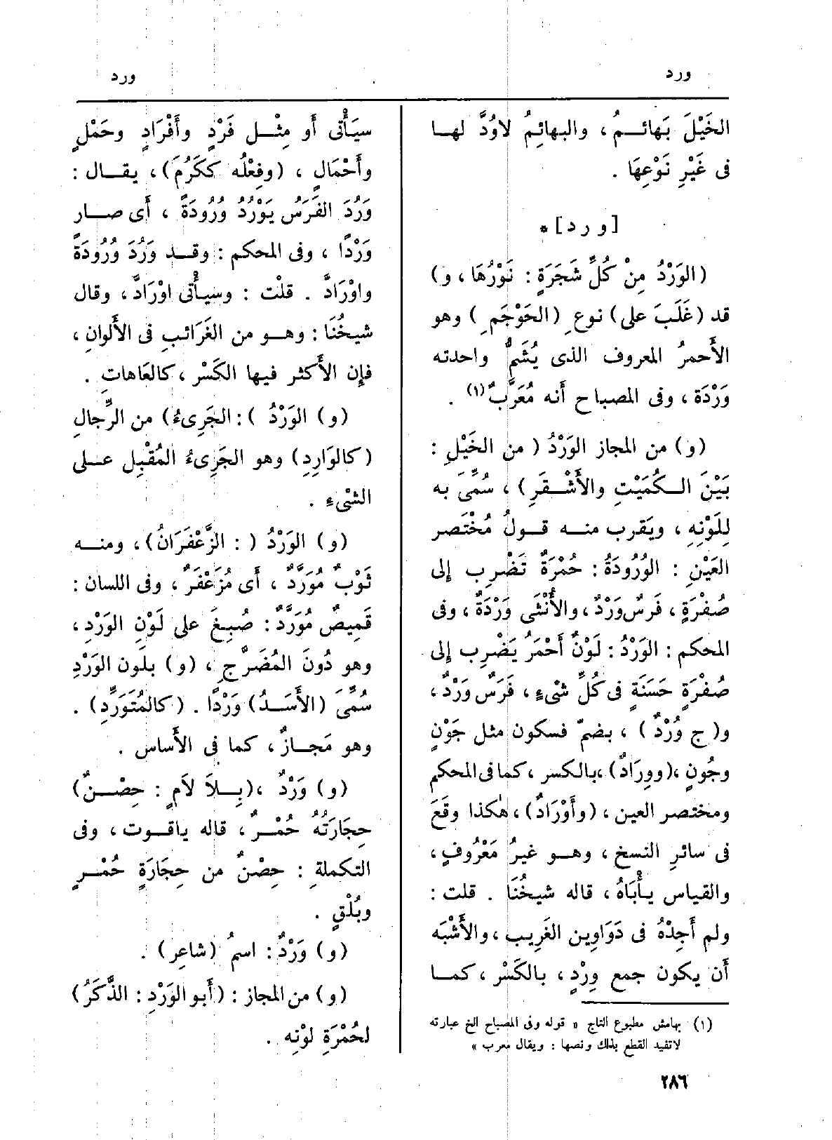 (و) من الْمجَاز الوَرْدُ (من الخَيْلِ: بَيْنَ الكُمَيْتِ والأَشْقَرِ) ، سُمِّيَ بِهِ لِلَوْنِهِ، ويَقرب مِنْهُ قولُ مُخْتَصر العَيْنِ: {الوُرُودَ: حُمْرَةٌ تَضْرِب إِلى صُفْرَةٍ، فَرسٌ} وَرْدٌ، والأُنْثَى {وَرْدَةٌ، وَفِي الْمُحكم: الوَرْدُ: لَوْنٌ أَحْمَرُ يَضْرِب إِلى صُفْرَةٍ حَسَنَةٍ فِي كُلِّ شيْءٍ، فَرَسٌ وَرْدٌ، و (ج} وُرْدٌ) ، بضمّ فَسُكُون مثل جَوْنٍ وجُونٍ، ( {ووِرَادٌ) ، بِالْكَسْرِ، كَمَا فِي الْمُحكم ومختصر الْعين، (} وأَوْرَادٌ) ، هاكذا وقَعَ فِي سائرِ النّسخ، وَهُوَ غيرُ مَعْرُوفٍ، والفياس يأْبَاهُ، قَالَه شيخُنَا. قلت: وَلم أَجِدْهُ فِي دَوَاوِين الغَرِيب، والأَشْبَه أَن يكون جمع {وِرْدٍ، بالكَسْر، كَمَا سيَأْتي أَو مِثْل فَرْدٍ وأَفْرَادٍ وحَمْلٍ وأَحْمَالٍ، (وفِعْلُه ككَرُمَ) ، يُقَال: وَرُدَ الفَرَسُ يَوْرُدُ وُرُودَةً، أَي صَار وَرْداً، وَفِي الْمُحكم: وَقد} وَرُدَ {ورُودَةً} واوْرَادَّ. قلْت: وسيأْتي اوْرَادَّ، وَقَالَ شيخُنَا: وَهُوَ من الغَرَائبه فِي الأَلوانِ، فإِن الأَكثر فِيهَا الكَسْر، كالعَاهاتِ.