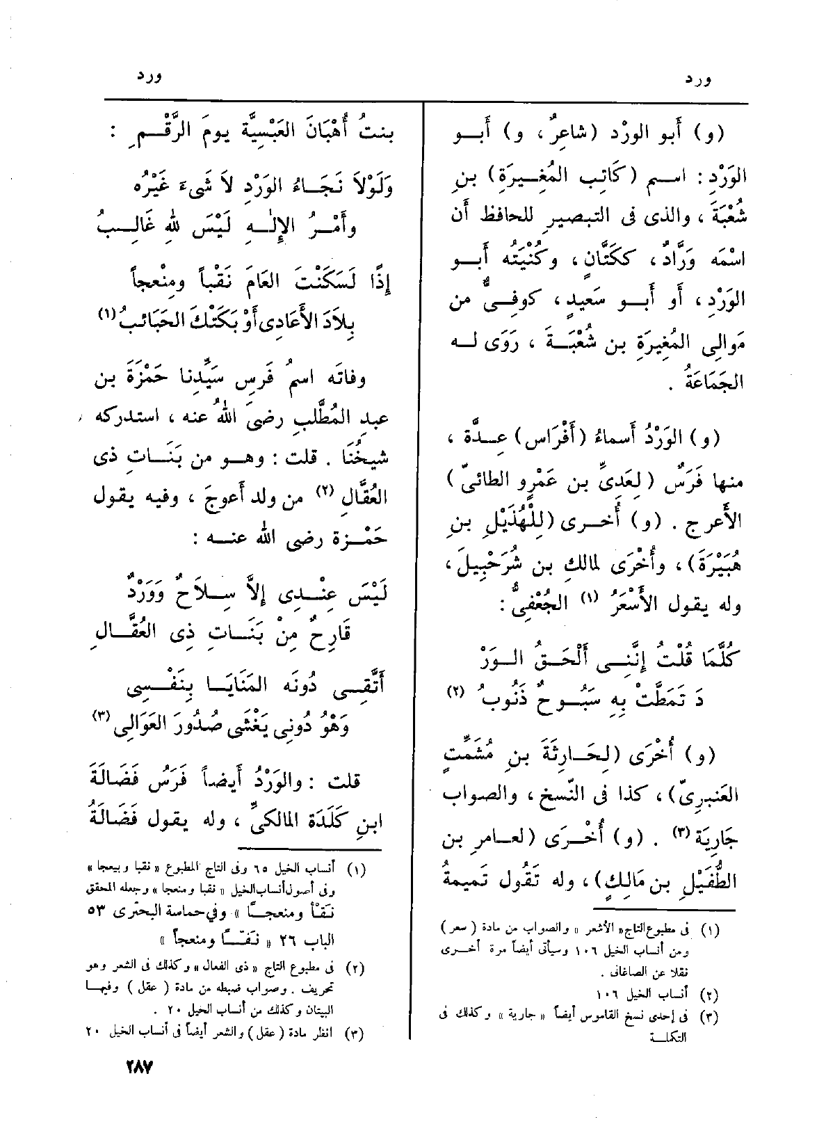 (و) الوَرْدُ أَسماءُ (أَفْرَاس) عِدَّة، مِنْهَا فَرَسٌ (لِعَديِّ بن عَمْرٍ والطائيّ) الأَعرج. (و) أُخرى (لِلْهُذَيْلِ بنِ هُبَيْرَةَ) ، وأُخْرعى لمالكِ بن شُرَحْبِيلَ، وَله يَقُول الأَسْعَرُ الجُعْفِيُّ: