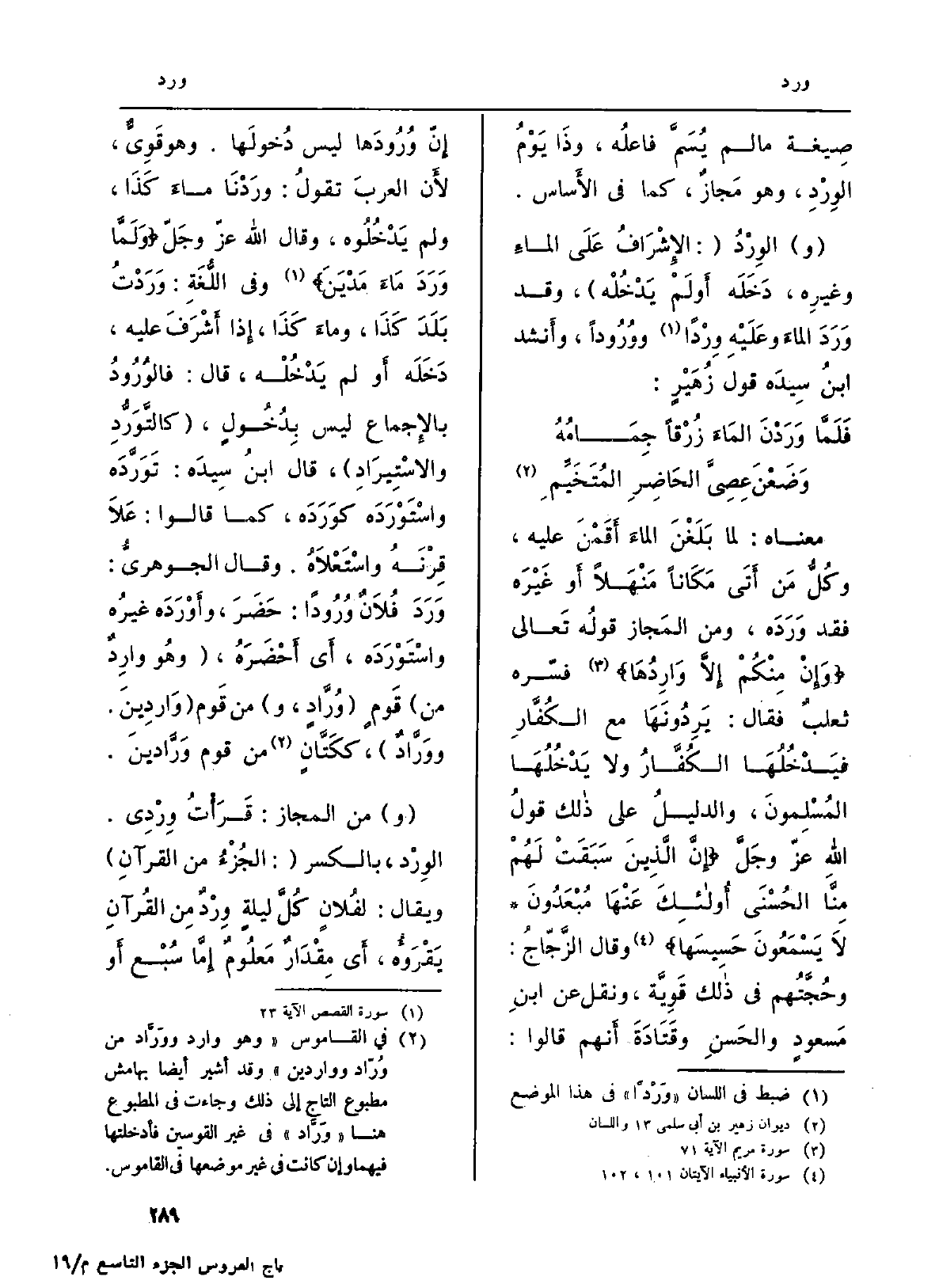 مَعْنَاهُ: لما بَلَغْنَ الماءَ أَقَمْنَ عَلَيْهِ، وكُلُّ مَن أَتَى مَكَاناً مَنْهَلاً أَو غَيْرَه فقد {وَرَدَه، وَمن المَجاز قولُه تَعالى: {وَإِن مّنكُمْ إِلاَّ} وَارِدُهَا} (سُورَة مَرْيَم، الْآيَة: 71) فسّره ثلعبٌ فَقَالَ: يَرِدُونَهَا مَعَ الكُفَّارِ فيَدْخُلُهَا الكُفَّارُ وَلَا يَدْخُلُهَا المُسْلِمونَ، والدليلخ على ذالك قولُ الله عزّ وجَلَّ {إِنَّ الَّذِينَ سَبَقَتْ لَهُمْ مّنَّا الْحُسْنَى أُوْلَئِكَ عَنْهَا مُبْعَدُونَ} لاَ يَسْمَعُونَ حَسِيَسَهَا (سُورَة الْأَنْبِيَاء، الْآيَتَانِ: 101 و 102) . وَقَالَ الزَّجّاجُ: وحُجَّتُهم فِي ذالك قَوِيَّة، وَنقل عَن ابنِ مَسعودٍ والحَسنِ وقَتَادَةَ أَنهم قَالُوا: إِنّ {وُرُودَها لَيْسَ دُخولَها. وَهُوَ قَوِيٌّ، لأَن العربَ تقولُ:} ورَدْنَا ماءَ كَذَا، وَلم يَدْخُلُوه، وَقَالَ الله عزّ وجَلّ: {وَلَمَّا وَرَدَ مَآء مَدْيَنَ} (سُورَة الْقَصَص، الْآيَة: 23) وَفِي اللُّغَةِ: {وَرَدْتُ بَلَدَ كَذَا، وماءَ كَذَا، إِذا أَشْرَفَ عَلَيْهِ، دَخَلَه أَو لم يَدْخُلْه، قَالَ:} فالوُرُودُ بالإِجماع لَيْسَ بِدُخُولٍ، ( {كالتَّوَرُّدِ} والاسْتِيرَادِ) ، قَالَ ابنُ سِيدَه: {تَوَرَّدَه} واسْتَوْرَدَه {كوَرَدَه، كَمَا قَالُوا: عَلاَ قِرْنَهُ واسْتَعْلاَهُ. وَقَالَ الجوهريُّ:} وَرَدَ فُلاَنٌ {وُرُوداً: حَضَرَ،} وأَوْرَدَه غيرُه {واسْتَوْرَدَه، أَي أَحْضَرَهُ، (وهُو} وارِدٌ من) قَومٍ ( {وُرَّادٍ، و) من قَوم (} وَاردِينَ. {ووَرَّادٌ) ، ككَتَّانٍ من قوم} وَرَّادينَ.
