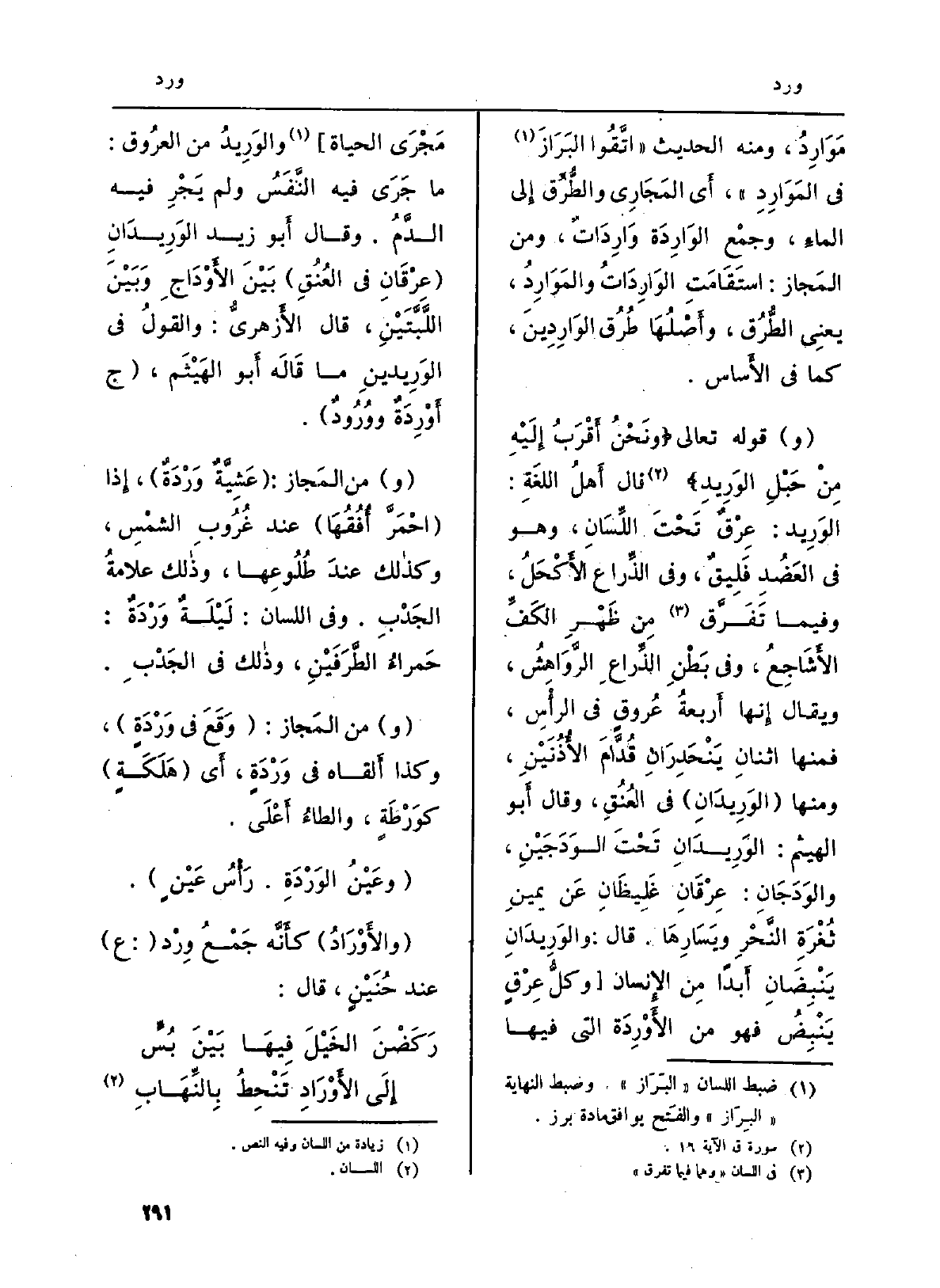 (و) قَوْله تَعَالَى: {وَنَحْنُ أَقْرَبُ إِلَيْهِ مِنْ حَبْلِ} الْوَرِيدِ} (سُورَة ق، الْآيَة: 16) قَالَ أَهلُ اللغَةِ: الوَريد: عِرْقٌ تَحْتَ اللِّسَانِ، وَهُوَ فِي العَضُدِ فَلِيقٌ، وَفِي الذِّراع الأَكْحَلُ، وَفِيمَا تَفَرَّق من ظَهْرِ الكَفِّ الأَشَاجِعُ، وَفِي بَطْنه الذِّراع الرَّوَاهِش، وَيُقَال إِنها أَربعةُ عُروقٍ فِي الرأْسِ، فَمِنْهَا اثنانِ يَنْحَدِرَانِ قُدَّامَ الأُذُنَيْنِ، وَمِنْهَا ( {الوَرِيدَانِ) فِي العُنُقِ، وَقَالَ أَبو الْهَيْثَم: الوَرِيدَانِ تَحْتَ الوَدَجَيْنِ، والوَدَجَانِ: عِرْقَانِ غَلِيظَانِ عَن يمينِ ثُغْرَةِ النَّحْرِ ويَسَارِهَا. قَالَ:} والوَرِيدَانِ يَنْبِضَانِ أَبداً مِن الإِنسان (وكلُّ عِرْقٍ يَنْبِضُ فَهُوَ من {الأَوْرِدَة الَّتِي فِيهَا مَجْرَى الْحَيَاة) } والوَرِيدُ من العرُوق: مَا جَرَى فِيهِ النَّفَسُ وَلم يَجحرِ فِيهِ الدَّمُ. وَقَالَ أَبو زيد الوَرِيدَانِ (عِرْقَانِ فِي العُنُقِ) بَيْنَ الأَوْدَاجِ وَبَيْنَ اللَّبَّتَيْنِ، قَالَ الأَزهريُّ: والقولُ فِي {الوَرِيدينِ مَا قَالَه أَبو الهَيْثَم، (ج} أَوْرِدَةٌ {ووُرُودٌ) .