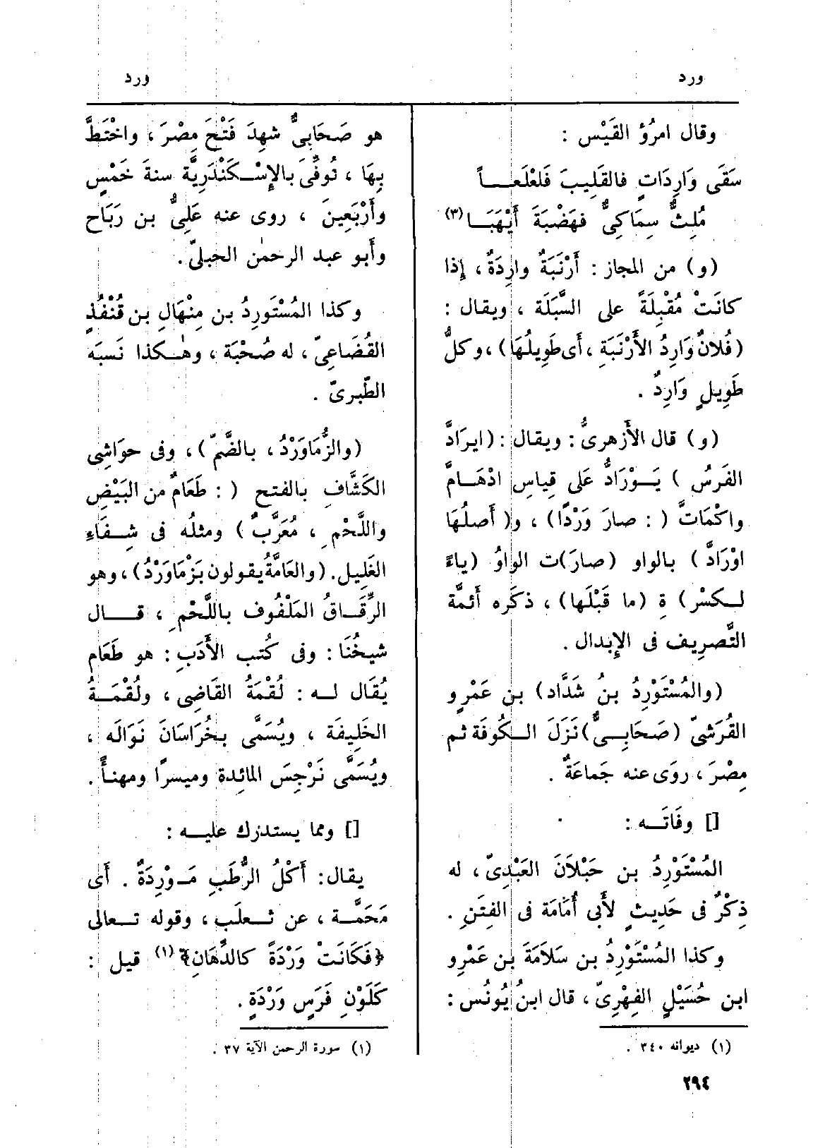 يُقَال: أَكْلُ الرُّطَبِ مَوْرِدَةٌ. أَي مَحَمَّة، عَن ثعلَب، وَقَوله تَعَالَى: {فَكَانَتْ وَرْدَةً كَالدّهَانِ} (سُورَة الرَّحْمَن، الْآيَة: 37) قيل: كَلَوْنِ فَرَسٍ وَرْدَةٍ.