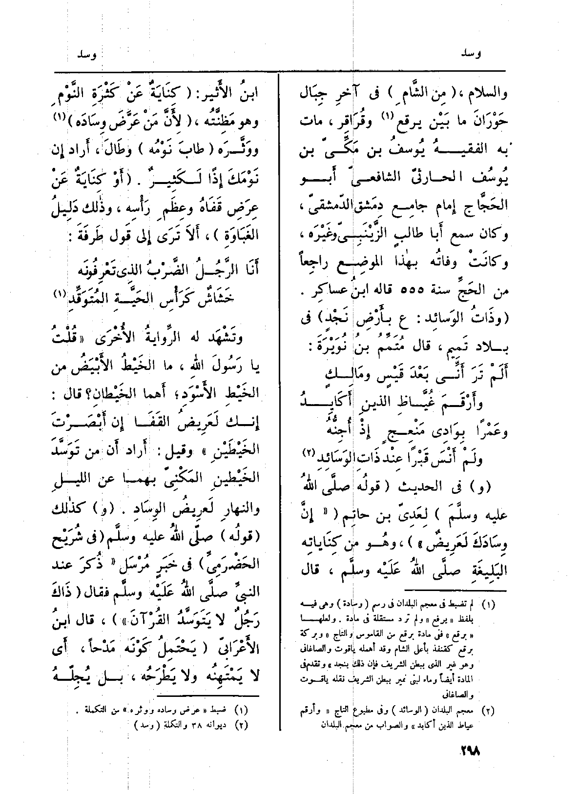 وتَشْهَد لَهُ الرِّوايةُ الأُخْرَى (قلْتُ يَا رَسُولَ الله، مَا الخَيْطُ الأَبْيَضُ من الخَيْطِ الأَسْوَدِ؛ أَهما الخَيْطانِ؟ قَالَ: إِنك لَعَرِيضُ القَفَا إِن أَبْصَرْتَ الخَيْطَيْنِ) وَقيل: أَراد أَن من تَوَسَّدَ الخَيْطَينِ المَكْنِيّ بهما عَن الليلِ والنهارِ لَعرِيضُ {الوِسَادِ. (و) كذالك (قولُه) صلّى الله عَلَيْهِ وسلَّم (فِي شُرَيْ الحَضْرَمِيَ) فِي خَبَرٍ مُرْسَلٍ (ذُكرَ عِنْد النبيِّ صلَّى الله عَلَيْه وسلَّم فَقَالَ (ذَاكَ رَجخلٌ لَا} يَتَوَسَّدُ القُرْآنَ)) ، قَالَ ابنُ الأَعْرَابيّ (يَحْتَمِلُ كَوْنَه مَدْحاً، أَي لَا يَمْتَهِنُه وَلَا يَطْرَحُه، بل يُجِلُّهُ