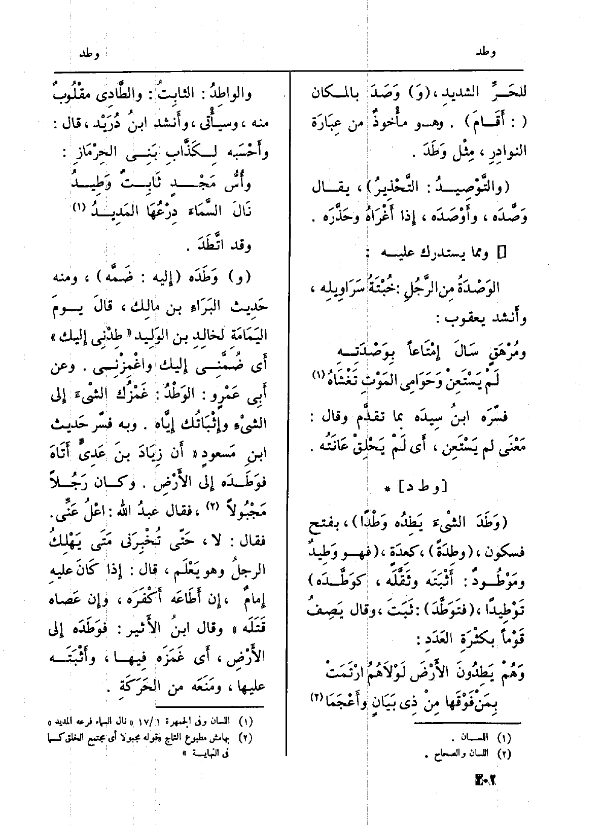 (و) {وَطَدَه (إِليه: ضَمَّه) ، وَمِنْه حَدِيث البَرَاءِ بن مالِك، قالَ يومَ اليَمَامَةِ لخالِدِ بن الوَلِيد (} - طِدْنِي إِليك) أَي ضُمَّنِي إِليك واغْمِزْنِي. وَعَن أَبِي عَمْرٍ و: {الوَطْدُ: غَمْزُك الشيْءَ إِلى الشيْءِ وإِثْبَاتُك إِيَّاه. وَبِه فسّر حَديث ابنِ مَسعودٍ (أَن زِيَادَ بنَ عَدِيَ أَتَاهَ} فوَطَدَه إِلى الأَرْضِ. وَكَانَ رَجُلاً مَجْبُولاً، فَقَالَ عبدُ الله: اعْلُ عَنِّي. فَقَالَ: لَا، حَتّى تُخْبِرَني مَتَى يَهْلِكُ الرجلُ وَهُوَ يَعْلَم، قَالَ: إِذا كَانَ عليهِ إِمامٌ، إِن أَطَاعَه أَكْفَرَه، وإِن عَصاه قَتَلَه) وَقَالَ ابنُ الأَثير:! فوَطَدَه إِلى الأَرْضِ، أَي غَمَزَه فِيها، وأَثْبَتَه عَلَيْهَا، ومَنَعَه من الحَرَكَةِ.