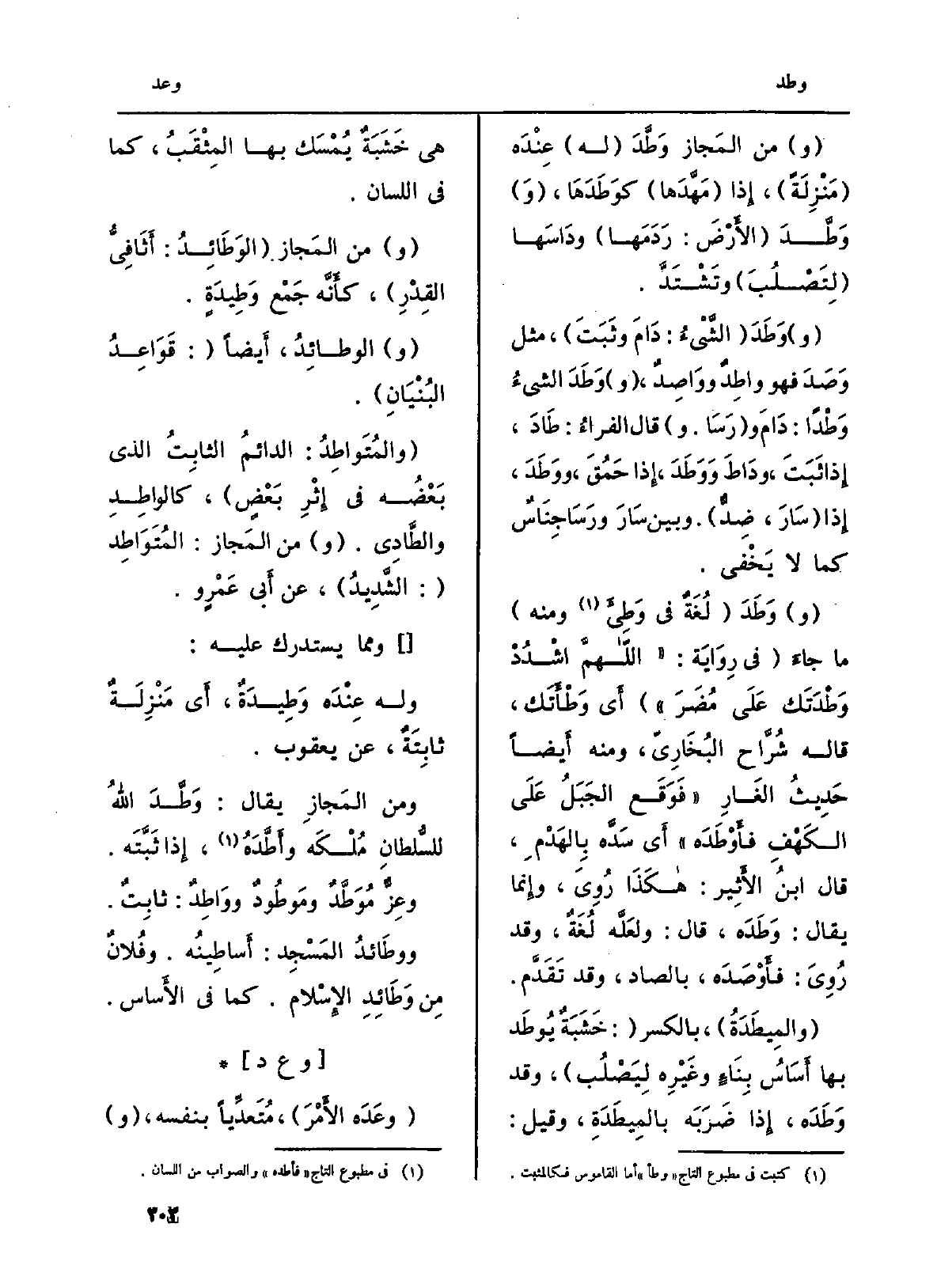 (و) وَطَدَ (لُغَةٌ فِي وَطِىءَ وَمِنْه) مَا جاءَ (فِي رِوَايَة: اللهمَّ اشْدُدْ} وَطْدَتَك عَلَى مُضَرَ)) أَي وَطْأَتَك، قَالَه شُرَّاح البُخَارِيّ، وَمِنْه أَيضاً حَدِيثُ الغَارِ (فَوَقَع الجَبَلُ عَلَى الكَهْفِ {فأَوْطَدَه) أَي سَدَّه بُالهَدْمِ، قَالَ ابنُ الأَثِير: هاكَذَا رُوَيِ، وإِنما يُقَال:} وَطَدَه، قَالَ: ولعَلَّه لُغَةٌ، وَقد رُوِيَ: فأَوْصَدَه، بالصَّاد، وَقد تَقَدَّم.