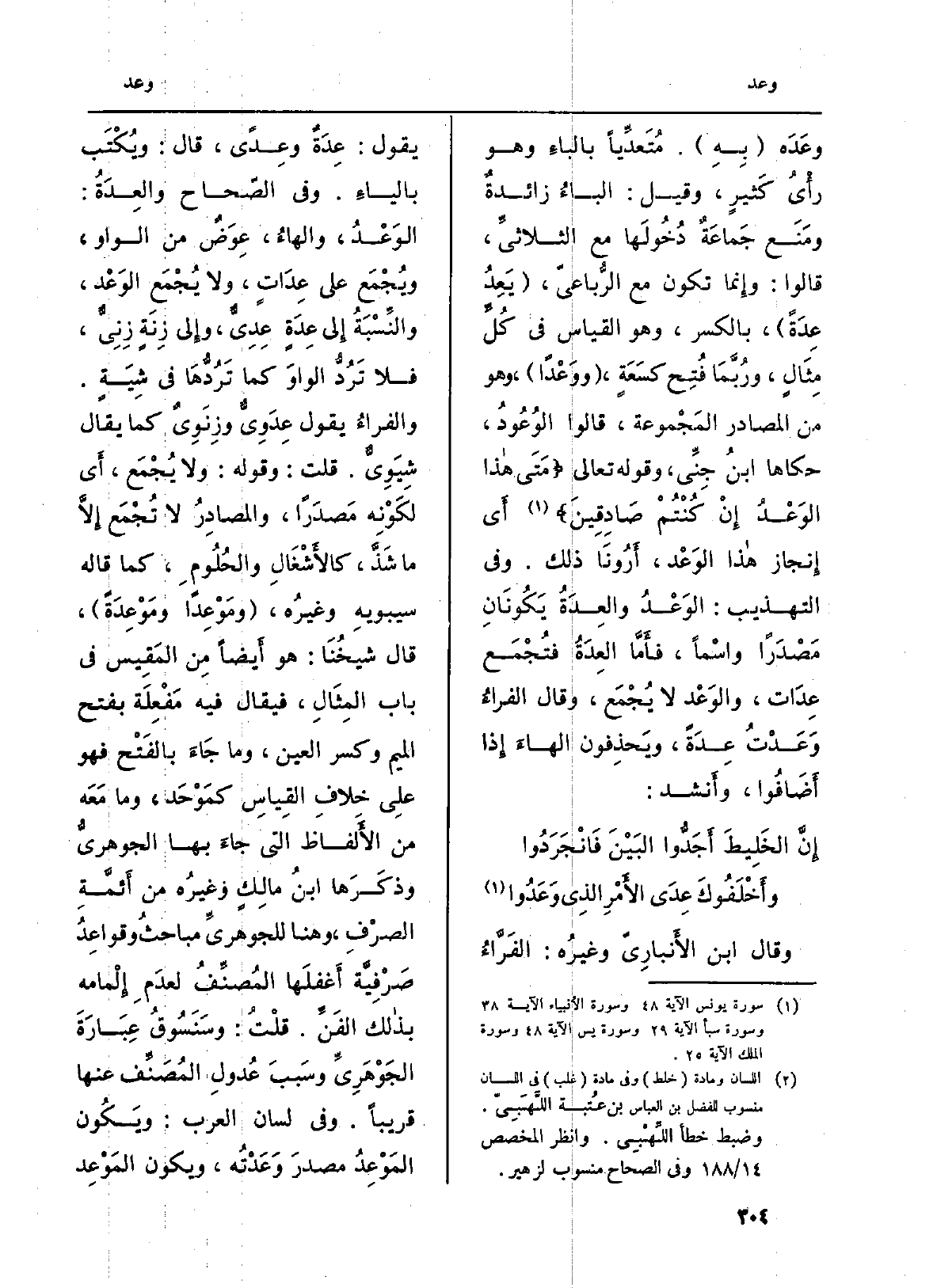{وعَدَه (بِهِ) . مُتَعدِّياً بالباءِ وَهُوَ رأْيُ كَثيرٍ، وَقيل: الْبَاء زائدةٌ ومَنَع جَماعَةٌ دُخُولَها مَعَ الثلاثيِّ، قَالُوا: وإِنما تكون مَعَ الرُّباعيّ، (} يَعِدُ {عِدَةً) ، بِالْكَسْرِ، وَهُوَ الْقيَاس فِي كُلِّ مِثَالٍ، ورُبَّمَا فُتِح كسَعَةٍ، (} ووَعْداً) ، وَهُوَ من المصادر المَجْموعة، قَالُوا {الوُعُودُ، حَكَاهَا ابنُ جِنِّي، وَقَوله تَعَالَى: {مَتَى هَاذَا} الْوَعْدُ إِن كُنتُمْ صَادِقِينَ} (سُورَة يُونُس، الْآيَة: 48) أَي إِنجاز هاذا الوَعْد، أَرُونَا ذَلِك. وَفِي التَّهْذِيب: الوَعْدُ {والعِدَةُ يَكُونَانِ مَصْدَراً واسْماً، فأَمَّا} العِدَةُ فتُجْمَع {عِدَات،} والوَعْد لَا يُجْمَع، وَقَالَ الفراءُ {وَعَدْتُ} عِدَةً، ويَحذِفون الهاءَ إِذا أَضَافُوا، وأَنشد: