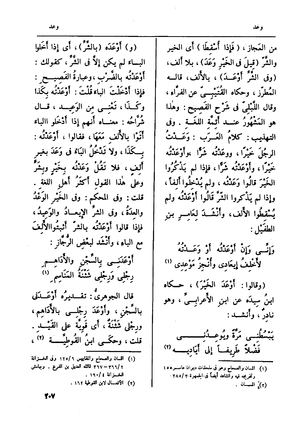 من المَجازِ، (فَإِذا أُسْقِطَا) أَي الْخَيْر والشَّرّ (قِيلَ فِي الخَيْرِ {وَعَدَ) ، بِلَا أَلف، (وَفِي الشَّرِّ} أَوْعَدَ) ، بالأَلف، قَالَه المُطرّز، وَحَكَاهُ القُتَيْبِيّ عَن الفرَّاءه، وَقَالَ اللَّبْليّ فِي شَرْح الفَصِيح: وهاذا هُوَ المَشْهورُ عِنْد أَئِمَّة اللغَةِ. وَفِي التَّهْذِيب: كلامُ العَرَب: {وَعَدْتُ الرجُلَ خَيْراً، ووعَدْتُه شَرًّا،} وأَوْعَدْتُه خَيْراً، {وأَوْعَدْتُه شَرًّا، فإِذا لم يَذْكُرُوا الخَيْرَ قالُوا} وَعَدْتُه، وَلم يُدْخِلُوا أَلِفاً، وإِذا لم يَذْكروا الشرَّ قالُوا {أَوْعَدْتُه وَلم يُسْقِطُوا الأَلف، وأَنْشَدَ لِعَامِرِ بنِ الطفَيْل: