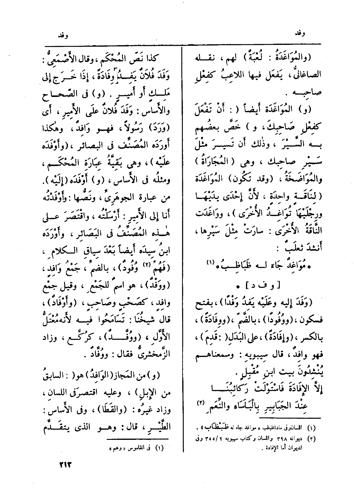 كَذَا نَصّ المُحْكَمِ، وَقَالَ الأَصْمَعِيُّ: وَفَدَ فُلاَنٌ} يَفِدُ {وِفَادَةً، إِذَا خَرَج إِلى مَلِكٍ أَو أَميرٍ. (و) فِي الصّحاح والأَساس:} وَفَدَ فُلانٌ علَى الأَمِيرِ، أَي (وَرَدَ) رَسُولاً، فَهُوَ {وَافِدٌ، وهاكذا أَورَدَه المُصَنِّففي البصائر، (} وأَوْفَدَه علَيْه) ، وَهِي بَقِيَّةُ عِبَارَةِ المُحْكَم، ومثلُه فِي الأَساس، (و) {أَوْفَدَه (إِلَيْه) . من عبارَة الجوهَرِيِّ، ونَصُّها:} وأَوْفَدْتُه أَنا إِلى الأَمِيرِ: أَرْسَلْتُه، واقْتَصَرَ على هاذِه المُصَنِّفُ فِي البَصَائِر، وأَوْرَدَه ابنُ سِيدَه أَيضاً بَعْدَ سِياقِ الكلامِ، (فَهُمْ {وُفُودٌ) ، بالضمِّ، جَمْعُ} وَافِدٍ، ( {ووَفْدٌ) ، هُوَ اسمٌ للجَمْعِ، وَقيل جمْع} وافِدٍ، كصَحْبٍ وصَاْبٍ، ( {وأَوْفَادٌ) ، قَالَ شيخُنَا: تَسَامَحُوا فِيهِ لأَنه مُعْتَلُّ الأَوَّلِ، (} ووُفَّدٌ) ، كرُكَّع، وَزَاد الزَّمخشريُّ فَقَالَ: {ووُفَّادٌ.