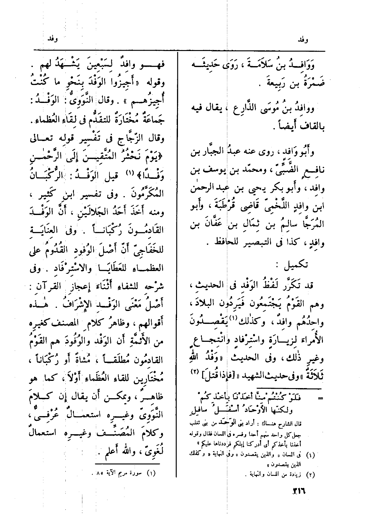 قد تَكَرَّر لَفْظُ الوَفْدِ فِي الحديثِ، وهم القَوْمُ يَجْتَمِعُون فَيَرِدُون البلادَ، واحدُهُم وافدٌ، وكاذلك يَقْصِدُونَ الأُمراءَ لِزيارَةٍ واسْتِرْفادٍ وانْتِجاعٍ وايرِ ذالك، وَفِي الحَدِيث (وَفْدُ الله ثَلاَثَةٌ) وَفِي حَدِيث الشَّهِيد ((فإِذا قُتلَ) فَهُوَ وافِدٌ لِسَبْعِينَ يَشْعِدُ لَهُم. وَقَوله: (أَجِيزُوا الوَفْدَ بِنَحْوِ مَا كُنْتُ أُجِيزُهم) . وَقَالَ النَّوَوِيُّ: الوَفْدُ: جَمَاعَةٌ مُخْتَارَةٌ للتقَدُّم فِي لِقَاءِ العُظماءِ. وَقَالَ الزّجَّاج فِي تَفْسِير قَوْله تَعَالَى: {يَوْمَ نَحْشُرُ الْمُتَّقِينَ إِلَى الرَّحْمَانِ وَفْداً} (سُورَة مَرْيَم، الْآيَة: 85) قيل الوَفْدُ: الرُّكْبَانُ المُكَرَّمُونَ. وَفِي تَفْسِير ابنِ كَثِير، وَمِنْه أَخَذَ أَحَدُ الجَلالَيْنِ، أَنَّ الوَفْدَ القَادِمُونَ رُكْبَاناً. وَفِي العِنَايَةِ للخَفَاجِيّ أَنَّ أَصْلَ الوُفودِ القُدُومُ على العظماءِ للعَطَايَا والاسْتِرْفَادِ. وَفِي شرْحهِ للشفاءِ أَثْنَاءَ إِعجازِ القرآنِ: أَصْلُ مَعْنَى الوَفْدِ الإِشْرَافُ. هاذه أَقوالهم، وظاهرُ كلامِ المُصَنّف كغيرِه من الأَئمَّةِ أَن} الوَفْد! والوُفُودَ هم القَوْمُ القادِمُون مُطلَقاً، مُشاةً أَو رُكْبَاناً، مُخْتَارِين للقاءِ العُظَماءِ أَوْلاَ، كَمَا هُوَ ظاهِرٌ، وَيُمكن أَن يُقَال إِن كلامَ النَّوَوِيّ وغيرِه استعمالٌ عُرْفِيٌّ، وكلامَ المُصَنِّف وغيرِه استعمالٌ لُغَويّ، وَالله أَعلم.