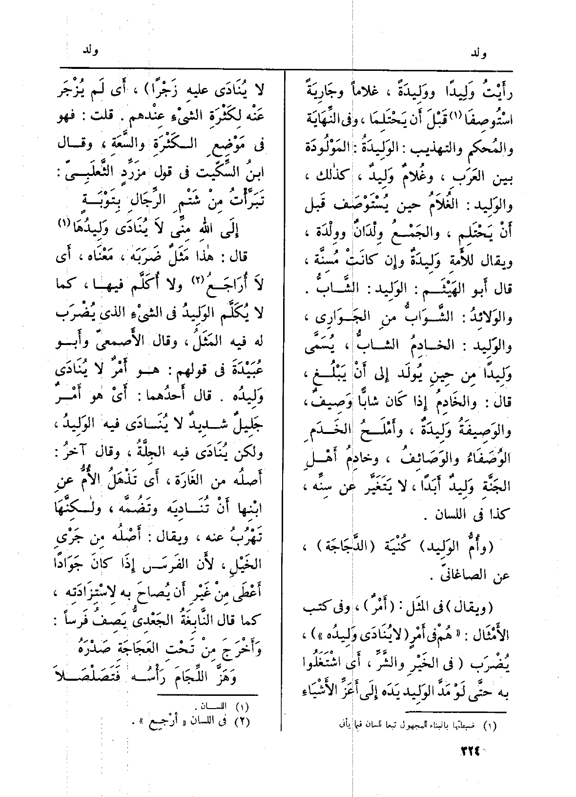 رأَيْتُ {وَلِيداً} ووَلِيدَةً، غُلَاما وجَارِيَةً السْتُوصِفَا قَبْلَ أَن يَحْتَلِمَا، وَفِي النِّهَايَة والمُحكم والتهذيب: الوَلِيدَةُ: المَوْلُودَة بَين العَرَبِ، وغُلامٌ حِين يُسْتَوْصَف قَبل أَنْ يَحْتَلِم، والجَمْعُ وِلْدَانٌ {ووِلْدَة، وَيُقَال للأَمةِ} وَلِيدَةٌ وإِن كانَتْ مُسِنَّة، قَالَ أَبو الهَيْثَ: الوَلِيد: الشَّابُّ. {والوَلائِدُ: الشَّوَابُّ منِ الجَوَارِي،} والوَلِيد: الخادمُ الشابُّ، يُسَمَّى وَلِيداً مِن حِينِ يُولَد إِلى أَنْ يُبْلُغ، قَالَ: والخَادِمُ إِذا كَان شابًّا وَصِيفٌ، والوَصِيفَةُ وَلِيدَةٌ، وأَمْلَحُ الخَدَمِ الوُصَفَاءُ والوَصَائِفُ، وخادِمُ أَهْلِ الجَنَّةِ {وَلِيدٌ أَبَداً، لَا يَتَغَيَّر عَن سِنِّه، كَذَا فِي اللِّسَان.