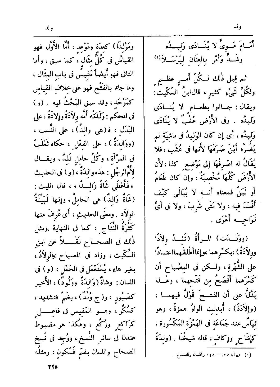 تَابع كتاب ( {وَوَلَدَت) المرأَةُ (} تَلِدُ {وِلاَداً} ووِلاَدَةً) ، بكسْرِهما، وإِنما أَطْلَقَهما اعْتِمَادًا على الشُّهْرَةِ، وَلَكِن فِي المِصْباح أَن كَسْرَهما أَفْصَحُ مِن فَتْحِهما، وهاذا يَدُلُّ على أَن الفتحَ قَوْلٌ فيهمَا، ( {وإِلاَدَةً) ، أُبدِلتِ الواوُ همزَة، وَهُوَ قِيَاسٌ عِنْد جَمَاعَةٍ فِي الهَمْزَةِ المَكْسُورة، كإِشَاحٍ وإِكافٍ، قَالَه شيخُنَا (} وَلِدَةً {ومَوْلِداً) كعِدَةٍ ومَوْعِدٍ، أَمَّا الأَوَّل فَهُوَ القياسُ فِي كُلِّ مِثَالٍ، كَمَا سبق، وأَما الثَّانِي فَهُوَ أَيضاً مَقِيسٌ فِي بابِ المِثَال، وَمَا جاءَ بالفَتْح فَهُوَ على خِلافِ القِياسِ كمَوْحَدٍ، وَقد سبق البَحْثُ فِيهِ. (و) فِي الْمُحكم: وَلَدَتْه أُمُّه وِلاَدَةً وإِلادَةً، على البَدَلِ، ف (هِيَ} وَالِدٌ) ، على النَّسب، ( {ووَالِدَةٌ) ، على الفِعْلِ، حَكَاهُ ثَعْلَبٌ فِي المَرْأَةِ، وكُلّ حامِلٍ} تَلِدُ، وَيُقَال لِأُمِّ الرجُلِ: هاذه {والِدَةٌ، (و) فِي الحَدِيث (فَأَعْطَى شَاةً} وَالِداً) ، قَالَ اللَّيْث: (شَاةٌ وَالِدٌ) هِيَ الحامِلُ، وإِنها لَبَيِّنَةُ {الوِلاَدِ. ومعنَى الحديثِ، أَي عُرِفَ مِنْهَا كَثْرَةُ النِّتَاجِ، كَمَا فِي النِّهَايَة. وَمثل ذالك فِي الصِّحَاح نَقْلاً عَن ابنِ السِّكّيت، وَزَاد فِي الْمِصْبَاح:} والوِلاَدُ، بِغَيْر هاءٍ، يُسْتَعْمَل فِي الحَمْلِ، (و) فِي اللِّسَان: وشاةٌ ( {وَالِدةٌ} ووَلُودٌ) ، الأَخير كصَبُورٍ، (ج! وُلَّدٌ) ، بضَمّ فتشديد، كسُكَّر، وَهُوَ المَقِيس فِي فاعِلٍ كرَاكعٍ ورُكَّع، وهاكذا هُوَ مضبوط عندنَا فِي سائرِ النُّسخ، ووُجِد فِي نُسخ الصِّحَاح وَاللِّسَان بضمّ فَسُكون، ومثلُه