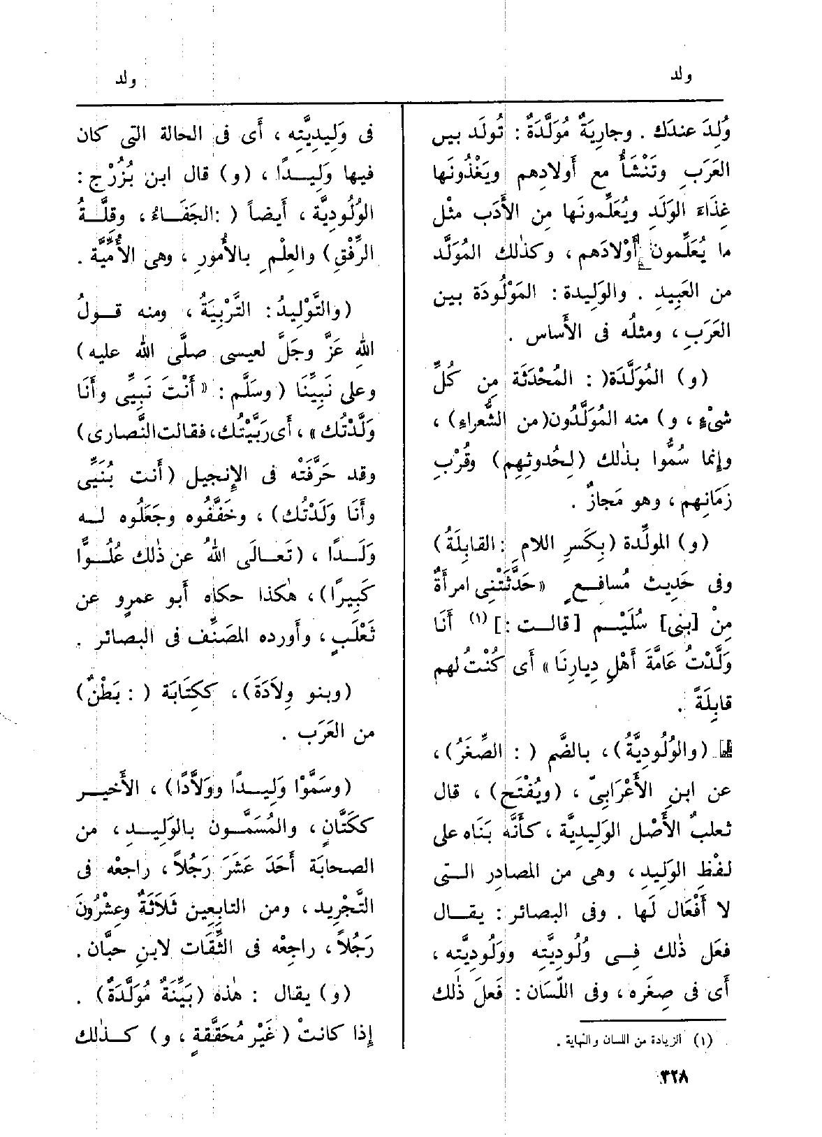 {وُلِدَ عندَك. وجارِيَةٌ} مُوَلَّدَةٌ: {تُولَد بَين العَرَبِ وتَنْشَأُ مَعَ أَولادهِم ويَغْذُونَا غِذَاءَ الوَلَدِ ويُعَلِّمونَها مِن الأَدَب مثْل مَا يُعَلِّمون أَوْلادَهم، وكذالك} المُوَلَّد من العَبِيدِ والوَلِيدة: المَوْلُودَة بَين العَرَبِ، ومثلُه فِي الأَساس.