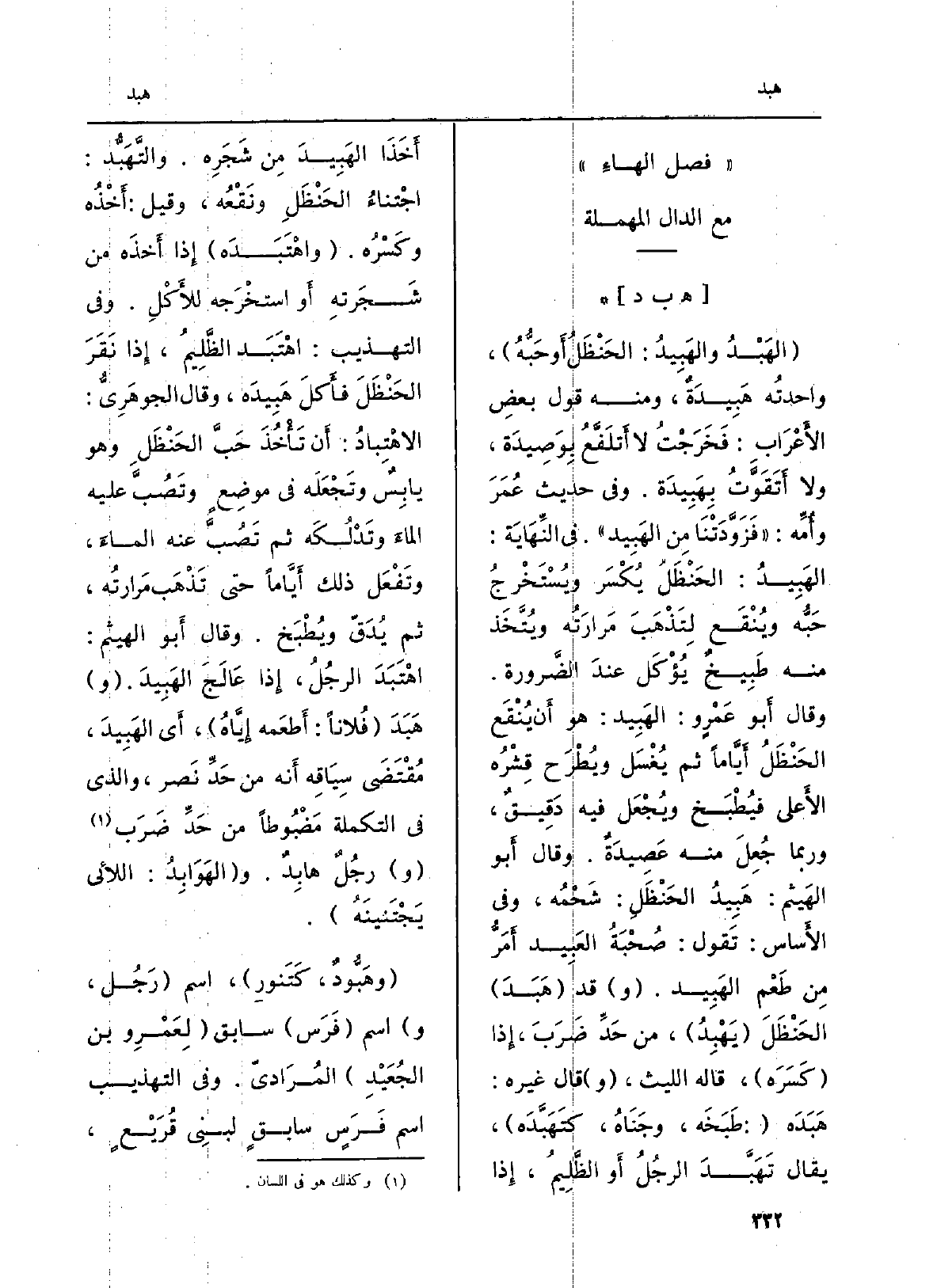 : (الهَبْدُ والهَبِيدُ: الحَنْظَلُ أَو حَبُّهُ) ، واحدتُه هَبِيدَةٌ، وَمِنْه قَول بعضِ الأَعْرَابِ: فَخَرَجْتُ لَا أَتلَفَّعُ بِوَصِيدَة، وَلَا أَتَقَوَّتُ بِهَبِيدَة. وَفِي حَدِيث عُمَرَ وأُمِّه: (فَزَوَّدَتْنَا مِن الهَبِيد) . فِي النِّهَايَة: الهَبِيدُ: الحَنْظَلُ يُكْسَر ويُسْتَخْرجُ حَبُّه ويُنْقَع لِتَذْهَبَ مَرارَتُه ويُتَّخَذ مِنْهُ طَبِيخٌ يُؤْكَل عندَ الضَّرورة. وَقَالَ أَبو عَمْرٍ و: الهَبِيد: هُوَ أَن يُنْقَع الحَنْظَلُ أَيَّاماً ثمَّ يُغْسَل ويُطْرَح قِشْرُه الأَعلى فيُطْبَخ ويُجْعَل فِيهِ دَقِيقٌ، وَرُبمَا جُعِلَ مِنْهُ عَصِيدَةٌ. وَقَالَ أَبو الهَيثم: هَبِيدُ الحَنْظَلِ: شَحْمُه، وَفِي الأَساس: تَقول: صُحْبَةُ العَبِيد أَمَرُّ مِن طَعْمِ الهَبِيد. (و) قد (هَبَدَ) الحَنْظَلَ (يَهْبِد) ، من حَدِّ ضَرَبَ، إِذا (كَسَرَه) ، طاله اللَّيْث (و) قَالَ غَيره: هَبَدَه (: طَبَخَ، وجَنَاهُ، كتَهَبَّدَه) ، يُقَال تَهَبَّدَ الرجُلُ أَو الظَّلِيمُ، إِذا أَخَذَا الهَبِيدَ مِن شجَرِه. والتَّهَبُّد: اجْتناءُ الحَنْظَلِ ونَقْعُ، وَقيل: أَخْذُه وكَسْرُه. (واهْتَبَدَه) إِذا أَخذَه من شَجَرتهِ أَو استخْرَجه للأَكْلِ. وَفِي التَّهْذِيب: اهْتَبَدَ الظَّلِيمُ، إِذا نَقَرَ الحَنْظَلَ فأَكلَ هَبِيدَه، وَقَالَ الجوهَرِيُّ: الاهْتِبادُ: أَن تَأْخُذَ حَبَّ الحَنْظَلِ وَهُوَ يابِسٌ وتَجْعَلَه فِي موضِعٍ وتَصُبَّ عَلَيْهِ الماءَ وتَدْلُكَه ثمَّ تَصُبَّ عَنهُ الماءَ، وتَفْعَل ذَلِك أَيَّاماً حَتَّى تَذْهَب مَرارتُه، ثمَّ يُدَقّ ويُطْبَخ. وَقَالَ أَبو الْهَيْثَم: اهْتَبَدَ الرجُلُ، إِذا عَالَجَ الهَبِيدَ. (و) هَبَدَ (فُلاناً: أَطعَمه إِيَّاهُ) ، أَي الهَبِيدَ، مُقْتَضَى سِيَاقِه أَنه من حَدِّ نَصر، وَالَّذِي فِي التكملة مَضْبُوطاً من حَدِّ ضَرَب (و) رجُلٌ هابِدٌ. و (الهَوَابِدُ: اللائي يَجْتَنينَهُ) .