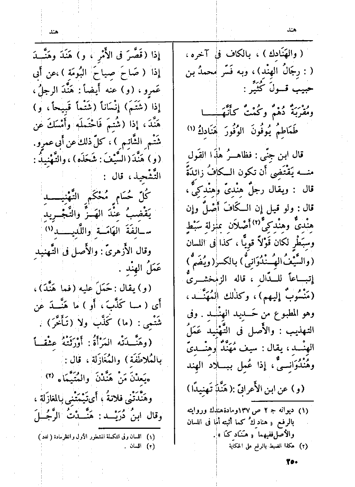 قَالَ ابْن جِنّي: فظاهرُ هاذا القَولِ مِنْهُ يَقْتَضِي أَن تكون الكافُ زائِدَةً قَالَ: وَيُقَال رجلٌ هِنْدِيّ وهِنْدِكِيٌّ، قَالَ: وَلَو قيل إِن الكَافَ أَصْلٌ وإِن هِنْدِيٌّ وهِنْدِكيٌّ أَصْلاَنِ بمنزلةِ سَبْطٍ وسِبَطْرٍ لَكَانَ قَوْلاً قوِيًّا، كَذَا فِي اللِّسَان (والسَّيْفُ الهِنْدُوَانِيُّ) بِالْكَسْرِ (ويُضَمُّ) إِتباعاً للدّالِ، قَالَه الزمخشريُّ (مَنْسُوبٌ إِليهم) ، وكذالك المُهَنَّد، وَهُوَ المطبوع من حَدِيد الهِنْدِ. وَفِي التَّهْذِيب: والأَصل فِي التَّهْنِيد عَمَلُ الهِنْدِ، يُقَال: سيف مُهَنَّدٌ وهِنْدِيّ وهُنْدُوَانِيٌّ، إِذا عُمِل بِبِلَاد الهِند.