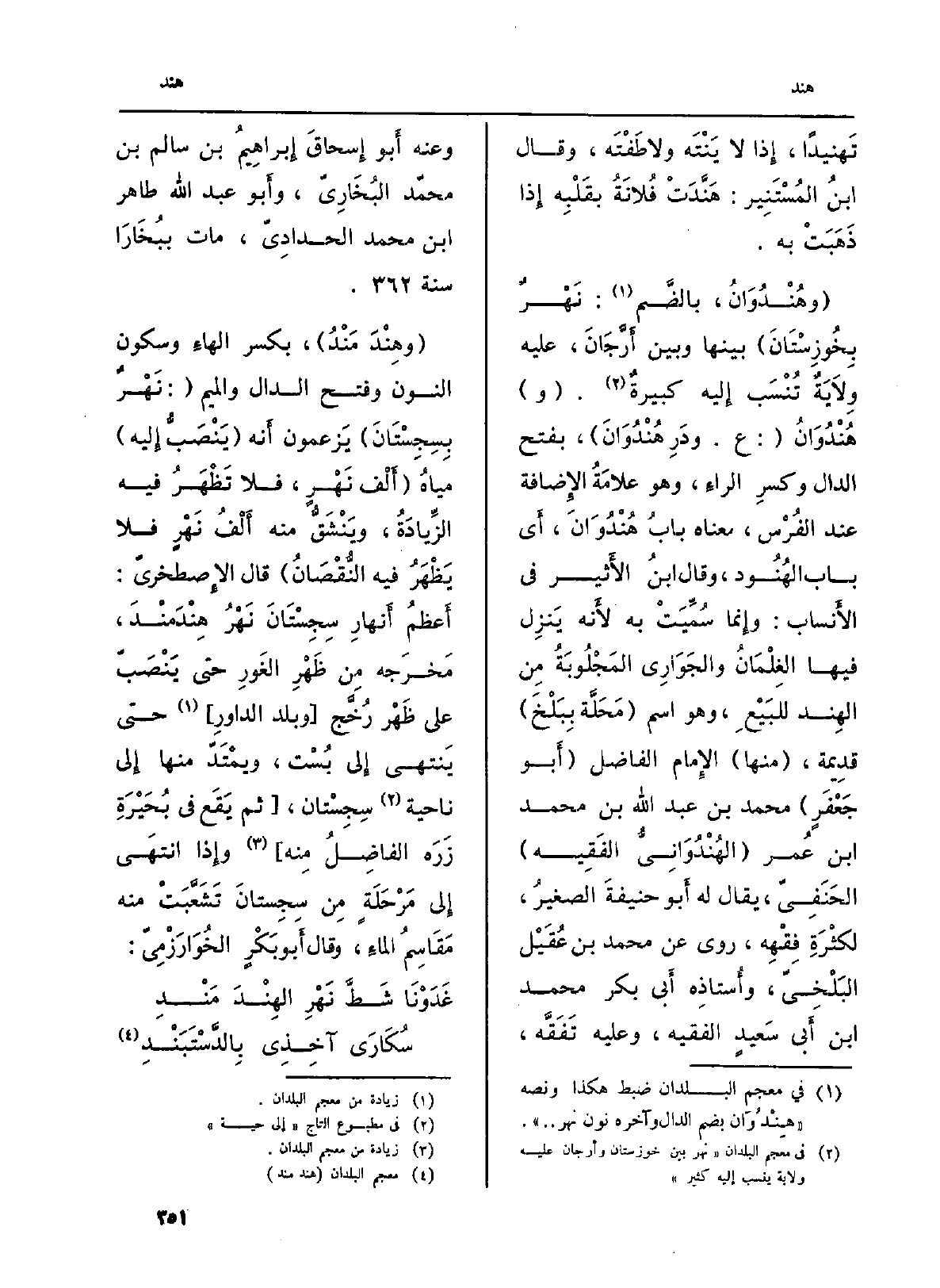 (وهُنْدُوَانُ، بالضَّم: نَهْرٌ بِخُوزِسْتَانَ) بَينهَا وَبَين أَرَّجَانَ، عَلَيْهِ وِلاَيَةٌ تُنْسَب إِليه كبيرةٌ. (و) هُنْدُوَانُ (: ع. ودَرِهُنْدُوَانَ) ، بِفَتْح الدَّال وكسرِ الراءِ، وَهُوَ علامَةُ الإِضافة عِنْد الفُرْس، مَعْنَاهُ بابُ هُنْدُوَانَ، أَي بَاب الهُنُود، وَقَالَ ابنُ الأَثير فِي الأَنساب، وإِنما سُمِّيتح بِهِ لأَنه يَنزِل فِيهَا الغِلْمَانُ والجَوَارِي المَجْلُوبَةُ من الهِند للبَيْعِ، وَهُوَ اسْم (مَحَلَّة بِبَلْخَ) قدِيمة، (مِنْهَا) الإِمام الْفَاضِل (أَبو جَعْفَرٍ) مُحَمَّد بن عبد الله بن مُحَمَّد بن عُمر (الهُنْدُوَانِيُّ الفَقِيه) الحَنَفِيّ، يُقَال لَهُ أَبو حنيفةَ الصغيرُ، الثْرَةِ فِقْهِه، روى عَن مُحَمَّد بن عُقَيْل البَلْخِيّ، وأُستاذِه أَبي بكر مُحَمَّد بن أَبي سَعيدٍ الْفَقِيه، وَعَلِيهِ تَفَقَّه، وَعنهُ أَبو إِسحاقَ أَبراهيمُ بن سَالم بن محمّد البُخَارِيّ، وأَبو عبد الله طَاهِر بن مُحَمَّد الحدادِيّ، مَاتَ ببُخَارَا سنة 362.