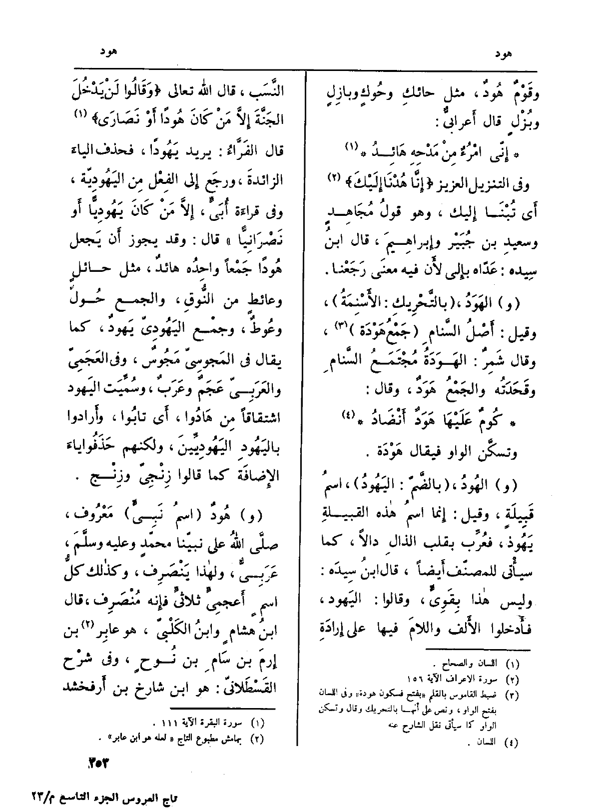 (و) {الهُودُ، (بالضَّمْ:} اليَهُودُ) ، اسمُ قَبِلَةٍ، وَقيل: إِنما اسمُ هاذه القبيلةِ يَهُوذ، فعُرِّب بقلب الذالِ دَالا، كَمَا سيأْتي للمصنّف أَيضاً، قَالَ ابنُ سِيدَه: وَلَيْسَ هاذا بِقَوِيَ، وَقَالُوا: اليَهود، فأَدخلوا الأَلف واللامَ فِيهَا على إِرادَةِ النَّسَب، قَالَ الله تَعَالَى: {وَقَالُواْ لَن يَدْخُلَ الْجَنَّةَ إِلاَّ مَن كَانَ {هُودًا أَوْ نَصَارَى} (سُورَة الْبَقَرَة، الْآيَة: 111) قَالَ الفَرَّاءُ: يُرِيد يَهُوداً، فَحذف الياءَ الزائدةَ، ورجَع إِلى الفِعْل من} اليَهُودِيّة، وَفِي قِرَاءَة أُبَيَ، إِلاَّ مَنْ كَانَ يَهُودِيًّا أَو نَصْرَانِيًّا) قَالَ: وَقد يجوز أَن يَجعل هُوداً جَمْعاً واحِدُه هائدٌ، مثل حائلٍ وعائطٍ من النُّوقِ، وَالْجمع حُول وعُوطٌ، وجمْع {- اليَهُودِيّ} يَهودٌ، كَمَا يُقَال فِي المَجوسِيّ مَجُوسٌ، وَفِي العَجَمِيّ والعَرَبِيّ عَجَمٌ وعَرَبٌ، وسُمِّيَت اليَهود اشتقاقاً مِن {هَادُوا، أَي تابُوا، وأَرادوا باليَهُودِ اليَهُودِيِّينَ، وَلَكنهُمْ حَذَفُوياءَ الإِضافَة كَمَا قَالُوا زِنْجِيّ وزِنْج.