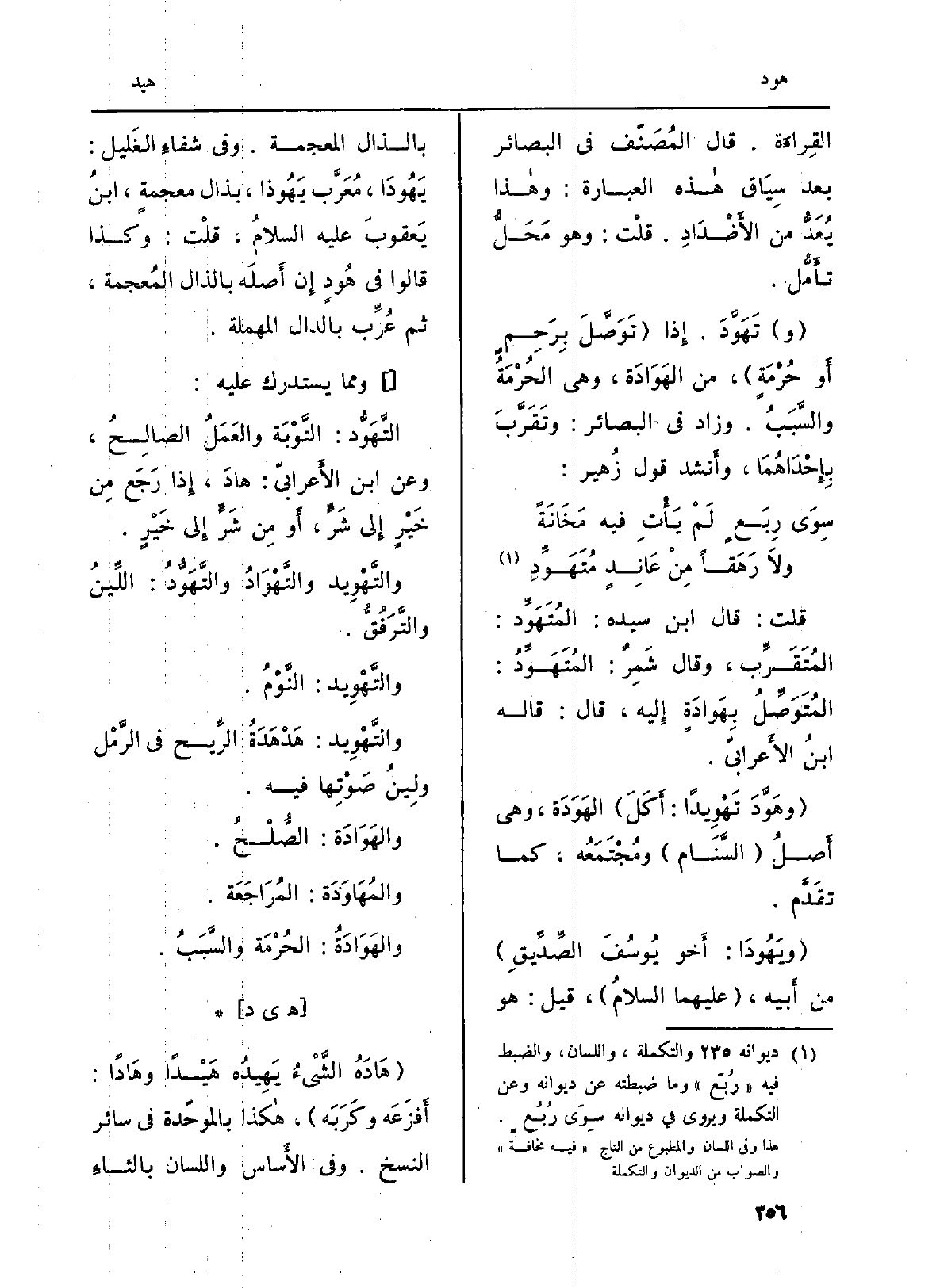 التَّهَوُّد: التَّوْبَة والعَمَلُ الصالِحُ، وَعَن ابْن الأَعرابيّ: هَادَ، إِذا رَجَع مِن خَيْرٍ إِلى شَرَ، أَو مِن شَرَ إِلى خَيْرٍ.