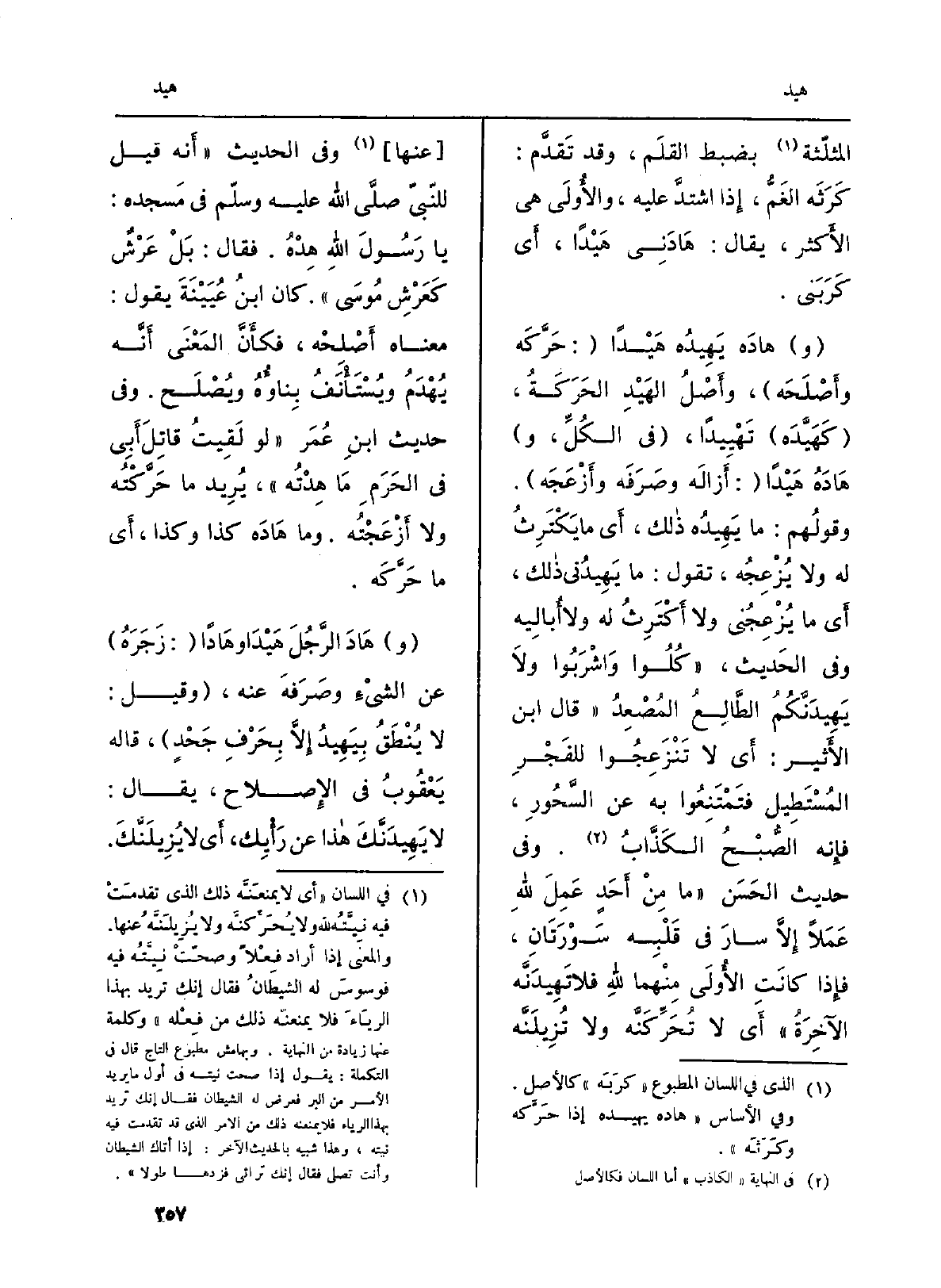 (و) {هادَه} يَهِيدُه {هَيْداً (: حَرَّكَه وأَصْلَحَه) ، وأَصْلُ} الهَيْدِ الحَرَكَةُ، ( {كَهَيَّدَه) } تَهْيِيداً، (فِي الكُلِّ، و) {هَادَهُ} هَيْداً (: أَزالَه وصَرَفَه وأَزْعَجَه) . وقولُهم: مَا {يَهِيدُه ذالك، أَي مَا يَكْتَرِثُ لِ وَلَا يُزْعِجُه، تَقول: مَا} - يَهِيدُني ذالك، أَي مَا يُزْعِجُني وَلَا أَكْتَرِثُ لَهُ وَلَا أُباليه وَفِي الحَديث، (كُلُوا وَاشْرعبُوا ولاَ {يَهِيدَنَّكُمُ الطَّالِعُ الُصْعِدُ (قَالَ ابْن الأَثير: أَي لَا تَنْزَعِوا للفَجْرِ المُسْتَطِيل فتَمْتَنِعُوا بِهِ عَن السَّحُورِ، فإِنه الصُّبْحُ الكَذَّابُ. وَفِي حَدِيث الحَسَن (مَا مِنْ أَحَدٍ عَمِلَ لله عَمَلاً إِلاَّ سارَ فِي قَلْبِه سَوْرَتَانِ، فإِذا كانَتِ الأُولَى مِنْهما لله فَلَا} تَهِيدَنَّه الآخِرَةُ) أَي لَا تُحَرِّكَنَّه وَلَا تُزِيلَنَّه (عَنْهَا) وَفِي الحَدِيث (أَنه قيل للنّبيّ صلى الله عَلَيْهِ وسلمفي مَسجده: يَا رَسُولَ الله هِدْهُ. فَقَالَ: بَلْ عَرْشٌ كَعَرْشِ مُوسَى) . كَانَ ابنُ عُيَيْنَةَ يَقُول: مَعْنَاهُ أَصْلِحْه، فكأَنَّ المَعْنَى أَنَّه يُهْدَمُ ويُسْتَأْنَفُ بِناؤُهُ ويُصْلَح. وَفِي حَدِيث ابنِ عُمعر (لَو لَقِيتُ قاتِلَ أَبِي فِي الحَرَمِ مَا {هِدْتُه) ، يُرِيد مَا حَرَّكْتُه وَلَا أَزْعَجْتُه. وَمَا} هَادَه كَذَا وَكَذَا، أَي مَا حَرَّكَه.