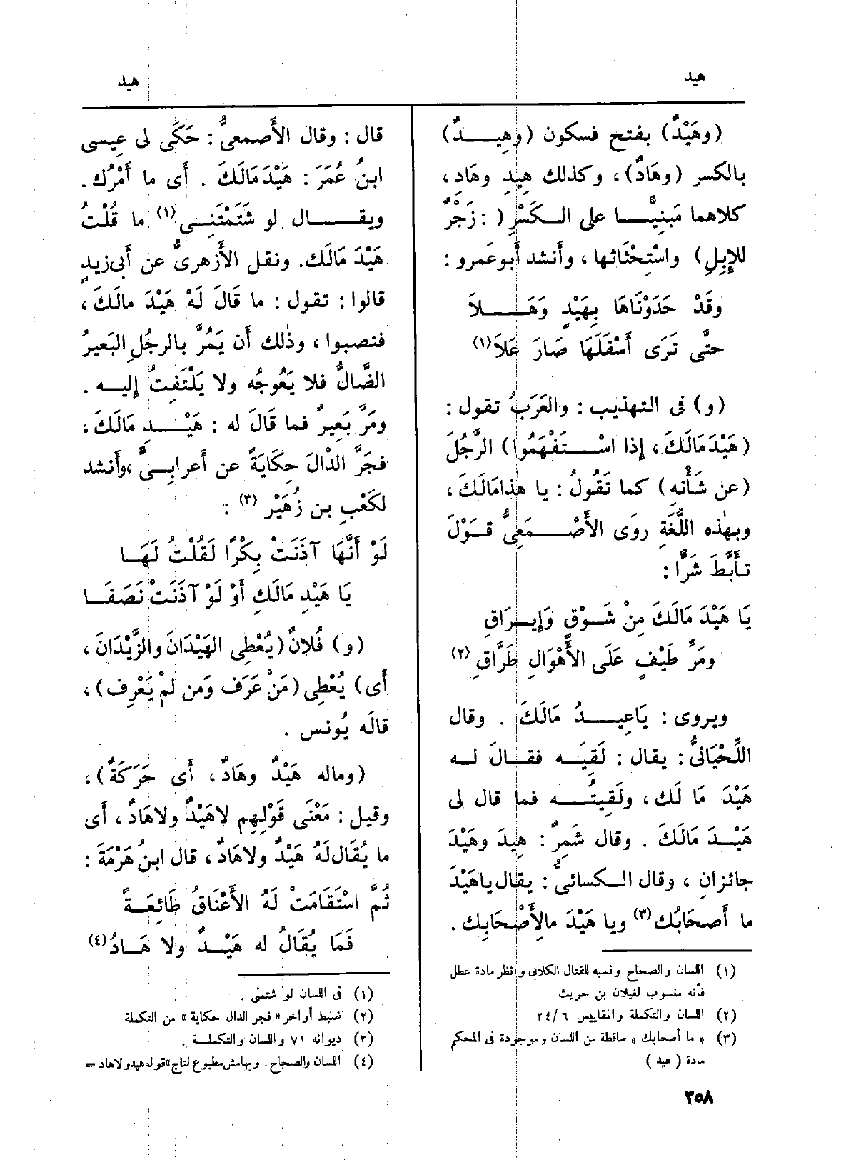 ويروى: يَا عِيدُ مَالَكَ. وَقَالَ اللِّحْيَانيُّ: يُقَال: لَقِيَه فقالَ لَهُ} هَيْدَ مَا لَك، ولَقِيتُه فَمَا قَالَ لي هَيْدَ مَالَكَ. وَقَالَ شَمِرٌ: {هِيدَ} وهَيْدَ جائزانِ، وَقَالَ الكسائيّ: يُقَال يَا هَيْدَ مَا أَصحَابُك وَيَا هَيْدَ مالِأَصْحَابِك. قَالَ: وَقَالَ الأَصمعيُّ: حَكَى لي عِيسى ابنُ عُمَرَ: هَيْدَ مَالَكَ. أَي مَا أَمْرُك. وَيُقَال لَو شَتَمْتَنِي مَا قُلْتُ هَيْدَ مَالَك. وَنقل الأَزهريُّ عَن أَبي زيدٍ قَالُوا: تَقول: مَا قَالَ لَهْ هَيْدَ مالَكَ، فنصبوا، وذالك أَن يَمُرَّ بالرجُلِ البَعيرُ الضَّالُّ فَلَا يَعُوجُه وَلَا يَلْتَفِتُ إِليه. ومَرَّ بِعَيرٌ فَمَا قعالَ لَهُ: هَيْدِ مَالَكَ، فجَرَّ الدالَ حِكَايَةً عَن أَعرابيَ، وأَنشد لكَعْبِ بن زُهَيْر: