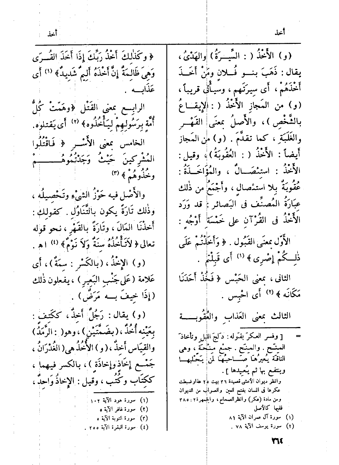 الثَّالِث بِمَعْنى العَذابِ والعُقُوبة {وَكَذالِكَ} أَخْذُ رَبّكَ إِذَا أَخَذَ الْقُرَى وَهِىَ ظَالِمَةٌ إِنَّ {أَخْذَهُ أَلِيمٌ شَدِيدٌ} (سُورَة هود، الْآيَة: 102) أَي عَذَابه.