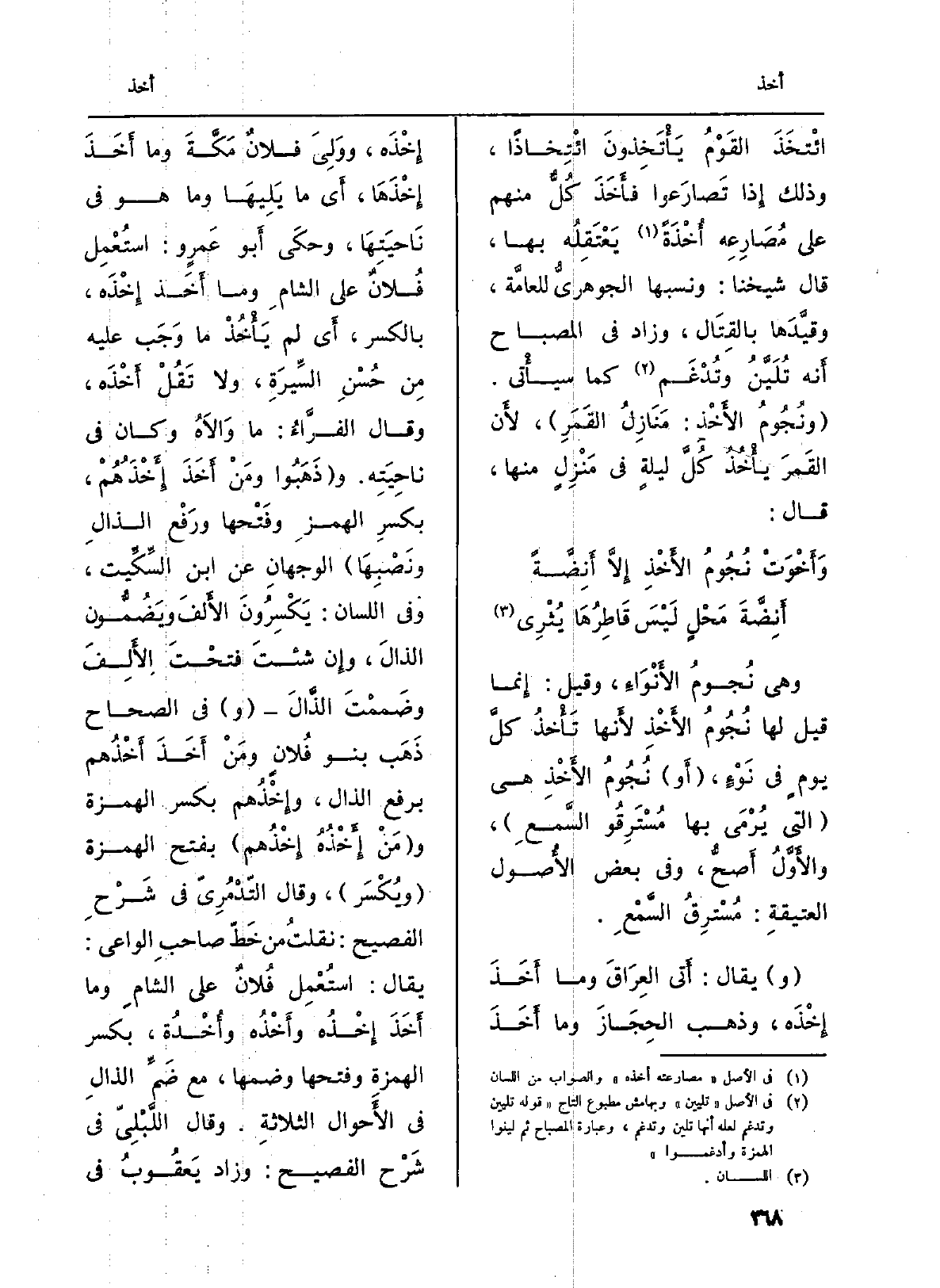 (و) يُقَال: أَتى العِرَاقَ وَمَا أَخَذَ} أَخْذَه، وَذهب الحِجَازَ وَمَا أَخَذَ {إِخْذَه، ووَلِيَ فلانٌ مَكَّةَ وَمَا أَخَذَ} إِخْذَهَا، أَي مَا يَلِيهَا وَمَا هُوَ فِي نَاحيَتِهَا، وحكَى أَبو عَمرٍ و: استُعْمِل فُلانٌ على الشامِ وَمَا أَخذ إِخْذَه، بِالْكَسْرِ، أَي لم {يَأْخُذْ مَا وَجَب عَلَيْهِ مِن حُسْنِ السِّيرَةِ، وَلَا تَقُلْ أَخْذَه، وَقَالَ الفرَّاءُ: مَا وَالاهُ وَكَانَ فِي ناحِيَت. (وذهِبُوا ومَنْ أَخَذَ} إِخْذَهُمُ، بكسرِ الهمزِ وفَتْحها ورَفْع الذالِ ونَصْبِهَا) الوجهانِ عَن ابْن السِّكِّيت، وَفِي اللِّسَان: يَكْسِرُونَ الأَلفَ ويَضُمُّون الذالَ، وإِن شئتَ فتحْتَ الأَلِفَ وضَممْتَ الذَّالَ (و) فِي الصِّحَاح ذَهَب بَنو فُلانٍ ومَنْ أَخَذَ أَخْذُهم بِرَفْع الذَّال، وإخْذُهم بِكَسْر الْهمزَة و (مَنْ {إِخْذُهُ} إِخْذُهم) بِفَتْح الْهمزَة (ويُكْسَر) ، وَقَالَ التّدْمُرِيّ فِي شَرْحِ الفصيح: نقلتُ من خَطّ صاحبِ الواعي: يُقَال: استُعْمِل فُلانٌ على الشامِ وَمَا {أَخَذَ} إِخْذُه {وأَخْذُه} وأُخْذُة، بِكَسْر الهمزةِ وَفتحهَا وَضمّهَا، مَعَ ضَمِّ الذالِ فِي الأَحوال الثلاثةِ. وَقَالَ اللَّبْلِيّ فِي شَرْح الفصيح: وَزَاد يَعقُوبُ فِي