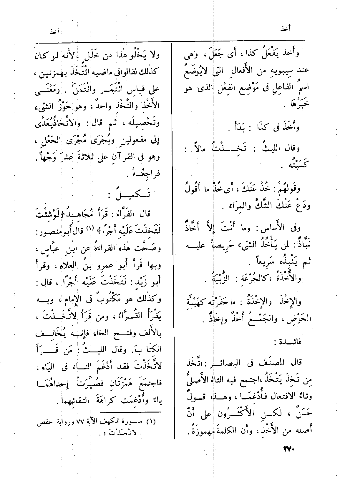 قَالَ الفَرصاءُ: قَرَأَ مُجَاهِدٌ {9. 033 لَو شِئْت {لتخذت عَلَيْهِ أجرا} (سُورَة الْكَهْف، الْآيَة: 77) قَالَ أَبو مَنْصُور: وصَحَّت هاذه القراءَةُ عَن ابنِ عبَّاسٍ، وَبهَا قَرأَ أَبو عمرِو بنُ العلاءِ، وقرأَ أَبو زَيْدٍ:} لَتَخَذْتَ عَلَيْهِ أَجْراً، قَالَ: وكذالك هُوَ مَكْتُوبٌ فِي الإِمام، وَبِه يَقْرَأُ القُرَّاءُ، وَمن قَرَأَ {لاتَّخَذْتَ، بالأَلف وَفتح الخاءِ فإِنه يُخَالِف الكِتَابَ. وَقَالَ الليثُ: مَن قَرَأَ} لاتَّخَذْتَ فقد أَدْغَمَ التاءَ فِي اليَاءِ، فاجتمَعَ هَمْزَتَانِ فصُيِّرَتْ إِحداهُمَا يَاء وأُدْغِمَت كراهَةَ التقائِهما.