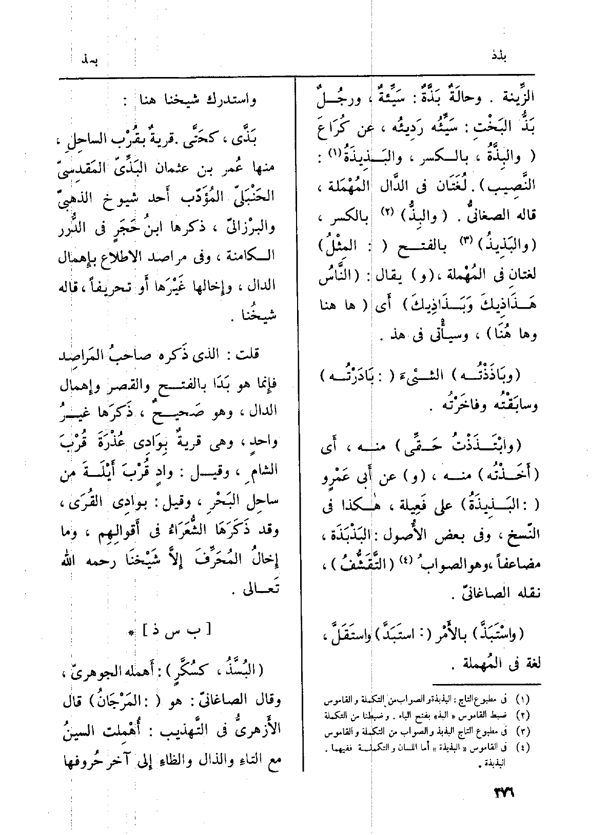 الزِّينة. وحالَةٌ {بَذَّةٌ: سَيِّئةٌ، ورجُلٌ بَذُّ البَخْتِ: سَيِّئُه رَدِيئُه، عَن كُرَاعَ (} والبِذَّةُ، بِالْكَسْرِ، {والبَذِيذَةُ: النَّصِيب) . لُغَتَان فِي الدَّال المُهْمَلة، قَالَه الصغانيُّ. (} والبِذُّ) بِالْكَسْرِ، ( {والبَذِيذُ) بِالْفَتْح (: المِثْلُ) لغتانِ فِي المُهْملة، (و) يُقَال: (النَّاسُ هَذَاذِيكَ وَ} بَذَاذِيكَ) أَي (هَا هُنَا وَهَا هُنَا) ، وسيأْتي فِي هَذ.