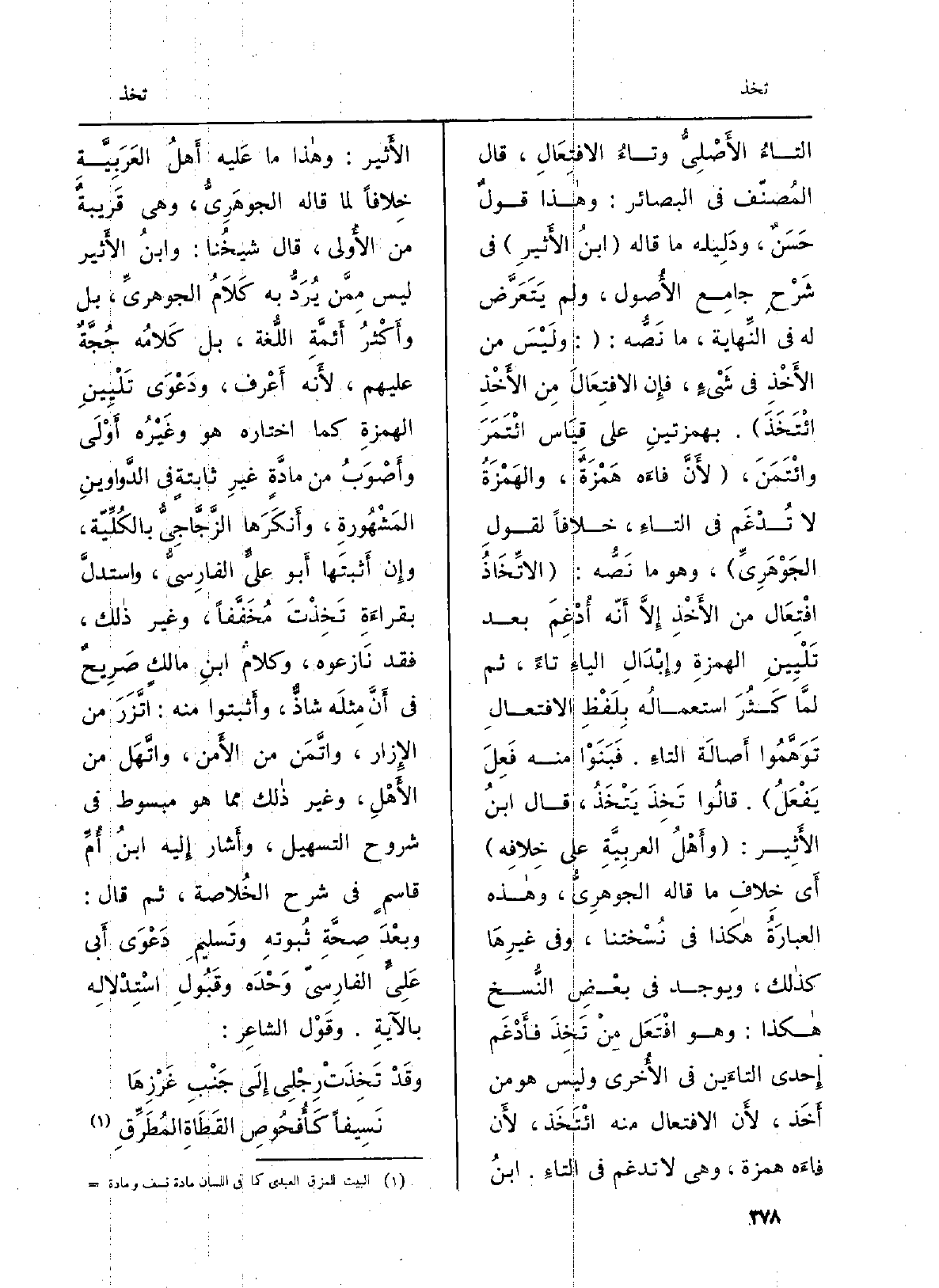 التاءُ الأَصْلِيُّ وتاءُ الافتِعَالِ، قَالَ المُصنّف فِي البصائر: وهاذا قولٌ حَسَنٌ، ودَلِيله مَا قَالَه (ابنُ الأَثيرِ) فِي شَرْحِ جامِع الأُصول، وَلم يَتَعَرَّض لَهُ فِي النِّهاية، مَا نَصُّه: (: ولَيْسَ من الأَخْذِ فِي شَيْءٍ، فإِن الافتِعَالَ مِن الأَخْذِ ائْتَخَذَ) ، بهمزتينِ على قِيَاس ائْتَمَرَ وائْتَمَنَ، (لأَنَّ فاءَه هَمْزَةٌ، والهَمْزَةُ لَا تُدْغَم فِي التاءِ، خلافًا لقولِ الجَوْهَرِيِّ) ، وَهُوَ مَا نَصَّه: (الاتِّخَاذُ افْتِعَال من الأَخْذِ إِلاَّ أَنّه أُدْغِمَ بعد تَلْيِينِ الهمزةِ وإِبْدَالِ الياءِ تَاء، ثمَّ لمَّا كَثُرَ استعمالُه بِلَفْظِ الافتعالِ تَوَهَّمُوا أَصالَة التاءِ. فَبَنَوْا مِنْهُ فَعِلَ يَفْعَلُ) . قالُوا تَخِذَ يَتْخَذُ، قَالَ ابنُ الأَثِير: (وأَهْلُ العربِيَّةِ على خِلافِه) أَي خِلافِ مَا قَالَه الجوهرِيُّ، وهاذه العبارَةُ هاكذا فِي نُسْختنا، وَفِي غيرِهَا كذالك، وَيُوجد فِي بعْضِ النُّسخ هاكذا: وَهُوَ افْتَعَل مِنْ تَخِذَ فأَدْغَم إِحدى التاءَين فِي الأُخرى ولس هُوَ من أَخَذ، لأَن الافتعال مِنْهُ ائْتَخَذ، لأَن الأَثير: وهاذا مَا عَليه أَهلُ العَرَبِيَّة خلافًا لما قَالَه الجوهَرِيُّ، وَهِي قَريبةٌ من الأُولى، قَالَ شيخُنا: وابنُ الأَثير لَيْسَ مِمَّن يُرَدُّ بِهِ كَلاَمُ الجوهريِّ، بل وأَكْثرُ أَئمَّةِ اللُّغة، بل كَلامُه حُجَّةٌ عَلَيْهِم، لأَنه أَعْرف، ودَعْوَى تَلْيِينِ الهمزةِ كَمَا اخْتَارَهُ هُوَ وغَيْرُه أَوْلَى وأَصْوَبُ من مادَّةٍ غيرِ ثابتةٍ فِي الدَّواوينِ المَشْهُورةِ، وأَنكَرَها الزَّجَّاجِيُّ بالكُلِّيّة، وإِن أَثبتَها أَبو عليَ الفارِسيُّ، واستدلَّ بقراءَةِ تَخِذْتَ مُخَفَّفاً، وَغير ذالك، فقد نَازعوه، وكلامُ ابنِ مالكٍ صَرِيحٌ فِي أَنَّ مِثلَه شاذٌّ، وأَثبتوا مِنْهُ: اتَّزَرَ من الإِزار، واتَّمَن من الأَمن، واتَّهَل من الأَهْلِ، وَغير ذالك مِمَّا هُوَ مَبْسُوط فِي شُرُوح التسهيل، وأَشار إِليه ابنُ أُمِّ قاسمٍ فِي شرح الخُلاصة، ثمَّ قَالَ: وبعْدَ صِحَّةِ ثُبوتهِ وتَسليمِ دَعْوَى أَبي عَلِيَ الفارِسيّ وَحْدَه وقَبُولِ اسْتِدْلالِه بالآيةِ. وقَوْل الشاعِر: