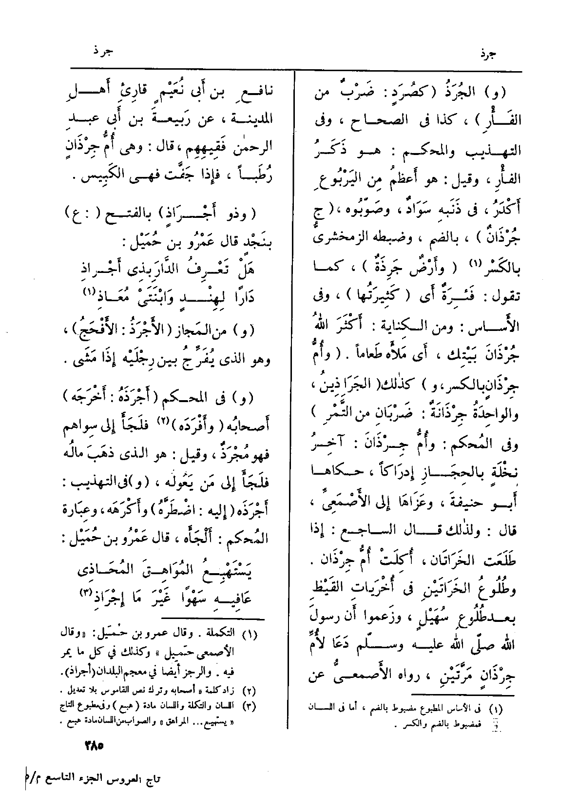 (و) الجُرَذُ (كصُرَدٍ: ضَرْبٌ من الفَأْرِ) ، كَذَا فِي الصِّحَاح، وَفِي التَّهْذِيب وَالْحكم: هُوَ ذَكَرُ الفأْرِ، وَقيل: هُوَ أَعظمُ مِن اليَرْبُوعِ أَكْدَرُ، فِي ذَنَبِه سَوَادٌ، وصَوَّبُوه، (ج جُرْذَانٌ) ، بِالضَّمِّ، وَضَبطه الزمخشريّ بالكَسْر (وأَرْضٌ جَرِذَةٌ) ، كَمَا تَقول: فَئِرَةٌ أَي (كَثِيرَتُها) ، وَفِي الأَساس: وَمن الكِناية: أَكْثَرَ الله جُرْذَانَ بَيْتِك، أَي مَلأَه طَعاماً. (وأُمُّ جِرْذَانٍ بِالْكَسْرِ، و) كذالك (الجَرَاذِينُ، والواحدَةُ جِرْذَانَةٌ: ضَرْبَانِ من التَّمْرِ) وَفِي المُحكم: وأُمُّ جِرْذَانَ: آخِرُ نخْلَةٍ بالحِجَازِ إِدرَاكاً، حَكَاهَا أَبو حنيفةَ، وعَزَاهَا إِلى الأَصْمَعِيِّ، قَالَ: ولذالك قَالَ الساجع: إِذا طَلَعَت الخَرَاتَان، أُكِلَتْ أُمُّ جِرْذَان. وطُلُوعُ الخَرَاتَيْنِ فِي أُخْرَياتِ القَيْظِ بعد طُلوعِ سُهَيْلٍ، وزَعموا أَن رسولَ الله صلى الله عَلَيْهِ وسلمدَعَا لأُمِّ جِرْذَانٍ مَرَّتَيْنِ، رَوَاهُ الأَصمعيُّ عَن نافعِ بن أَبي نُعَيْمٍ قارِىء أَهلِ الْمَدِينَة، عَن رَبيعةَ بن أَبي عبدِ الرحمامن فَقِيهِهِم، قَالَ: وَهِي أُمُّ جِرْذَانٍ رُطَباً، فإِذا جَفَّت فَهِيَ الكَبِيس.