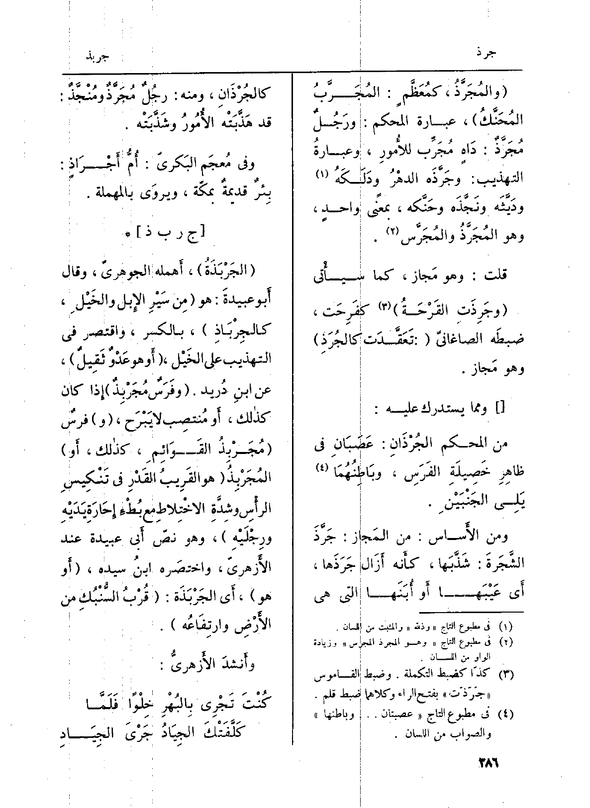 وَمن الأَساس: من المَجاز: جَرَّذَ الشَّجَرَةَ: شَذَّبَها، كأَنه أَزَال جَرَذَها، أَي عَيْبَها أَو أُبَنَها الَّتِي هِيَ كالجُرْذَانِ، وَمِنْه: رجُلٌ مُجَرَّذٌ ومُنْجَّذٌ: قد هَذَّبَتْه الأُمُورُ وشَذَّبَتْه.