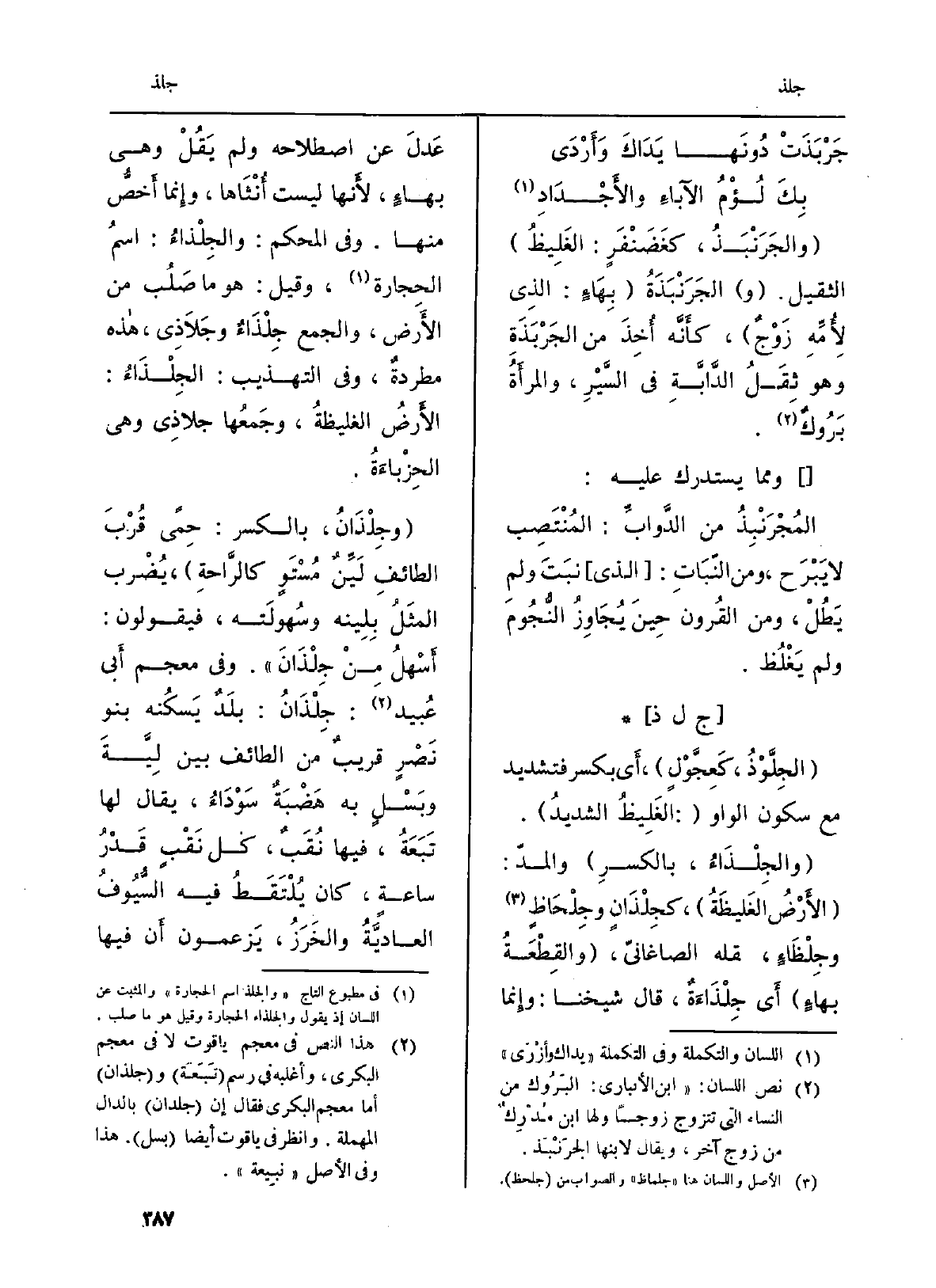(والجِلْذَاءُ، بالكسرِ) والمدّ: (الأَرْضُ الغَليظَةُ) ، كجِلْذَانٍ وجِلْحَاظٍ وجِلْظَاءٍ، نَقله الصاغانيّ، (والقِطْعَةُ بهاءٍ) ، أَي جِلْذَاءَةٌ، قَالَ شَيخنَا: وإِنما عَدلَ عَن اصصلاحه وَلم يَقُلْ وَهِي بهاءٍ، لأَنها لَيست أُنْثَاها، وإِنما أَخصُّ مِنْهَا. وَفِي الْمُحكم: والجِلْذاءُ: اسمُ الحِجارة، وَقيل: هُوَ مَا صَلُب من الأَرض، وَالْجمع جِلْذَاءٌ وجَلاَذِي، هاذه مطردةٌ، وَفِي التَّهْذِيب: الجِلْذَاءُ: الأَرضُ الغليظةُ، وجَمعُها جلاذِي وَهِي الحِزْباءَةُ.